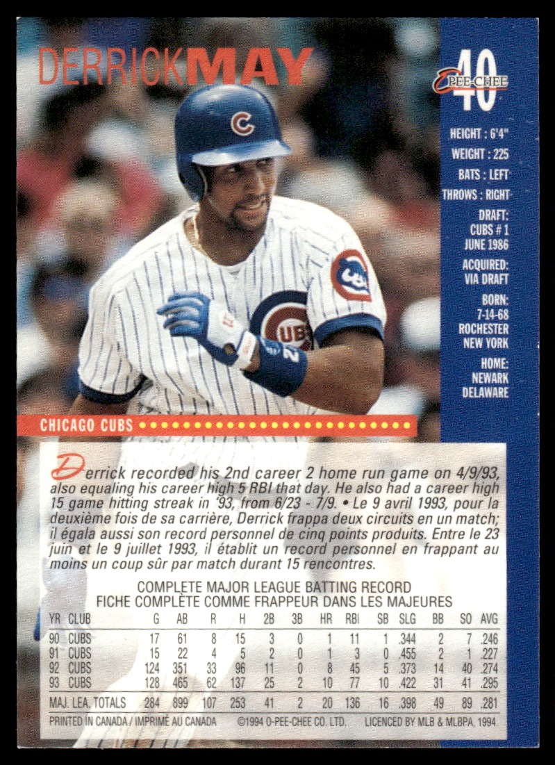 | 1994 O-Pee-Chee Derrick May Chicago Cubs #40 |