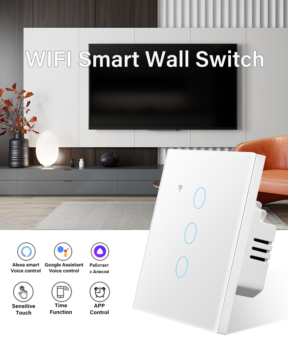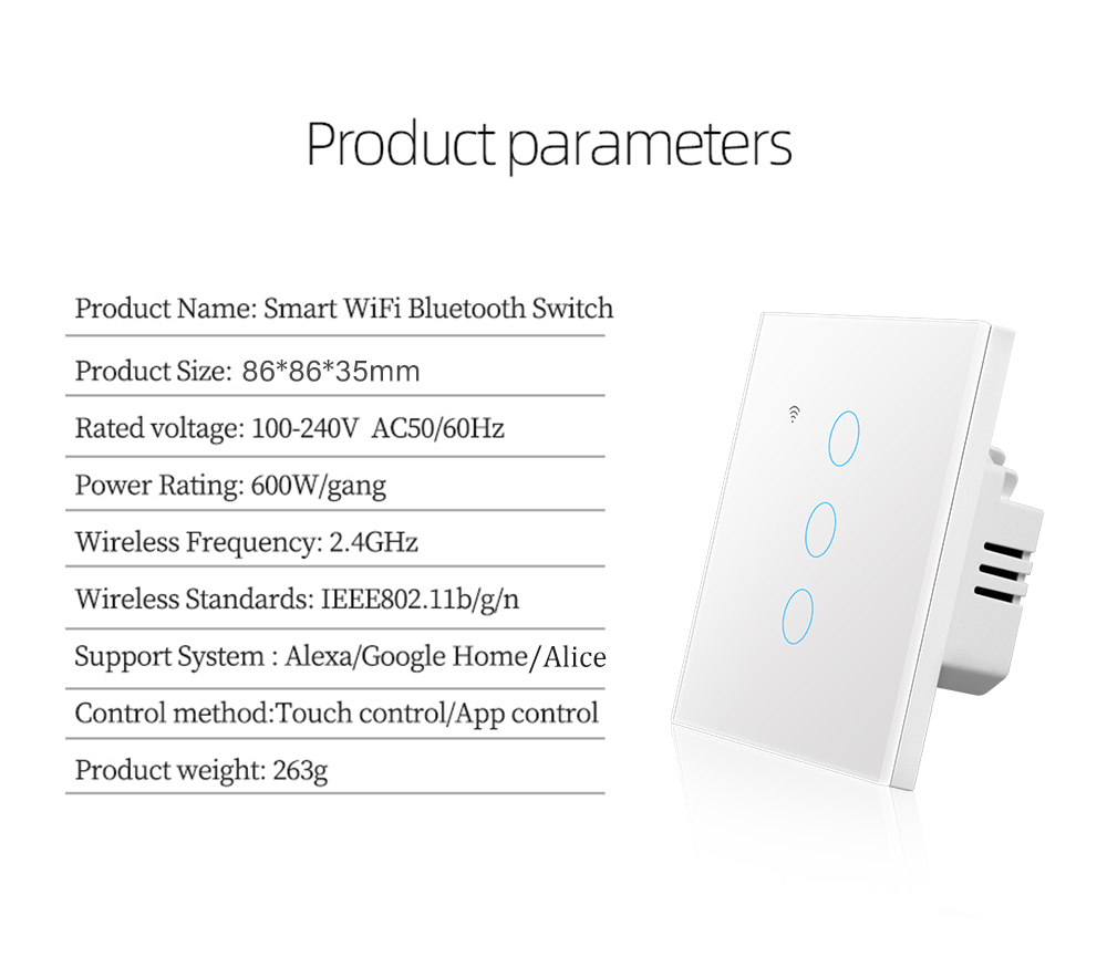 1、Differ in features from traditional common switch,this smart switch is able to be controlled by various ways alone with the best value like App control,touch control,voice control ,achieve multi-control by associating to other smart switches.