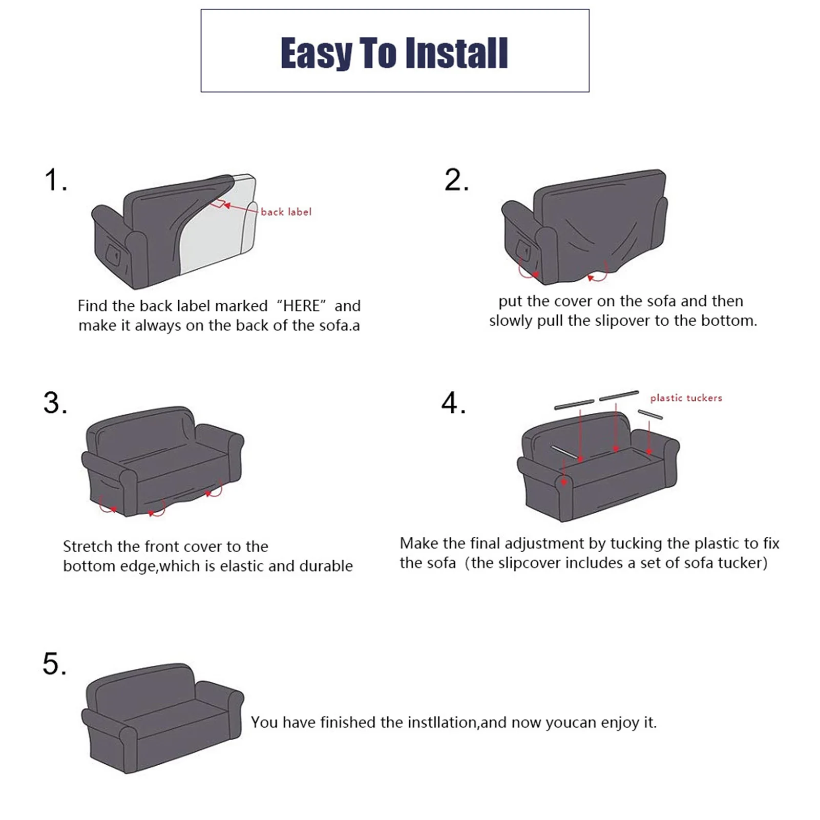 1.Find the back label marked ”HERE“and make it always on the back of the sofa