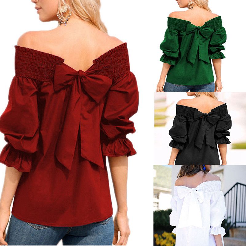 New Sexy Off Shoulder Spring Summer Strapless Women Blouse Bowknot Tops Slash Neck Shirts Casual Loose Blusas Plus Size