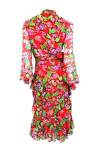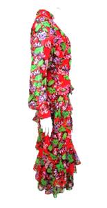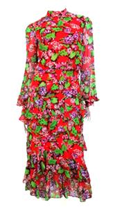 SALONI CHERRY RED FLORAL PRINT ISA MIDI DRESS WITH STAND COLLAR, LONG SLEEVES WITH BUTTON CUFFS, TIERED RUFFLED SKIRT, CONCEALED BACK ZIP CLOSE, LINED.