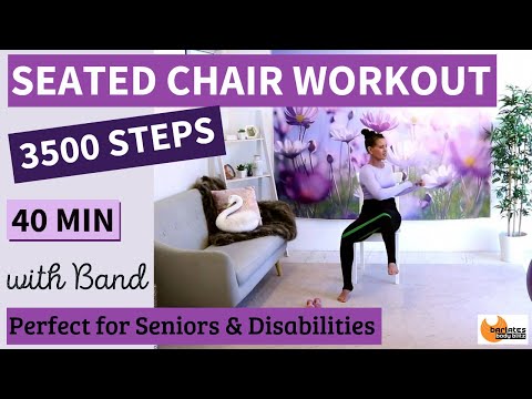 In this 40 minute Chair workout you will do the equivalent of 3500 Steps, all whilst seated in a chair. You will use a resistance band to work your arms and legs during some of the exercises, but this band is optional and you can easily do the workout without. Every 50 seconds the movement will change to make it more fun and interesting. No difficult choreography in this one, just easy to follow steps and arm exercises that will burn a ton of calories. There are easier modifications shown throughout and also examples of upper body only modifications! Get ready to sweat!
