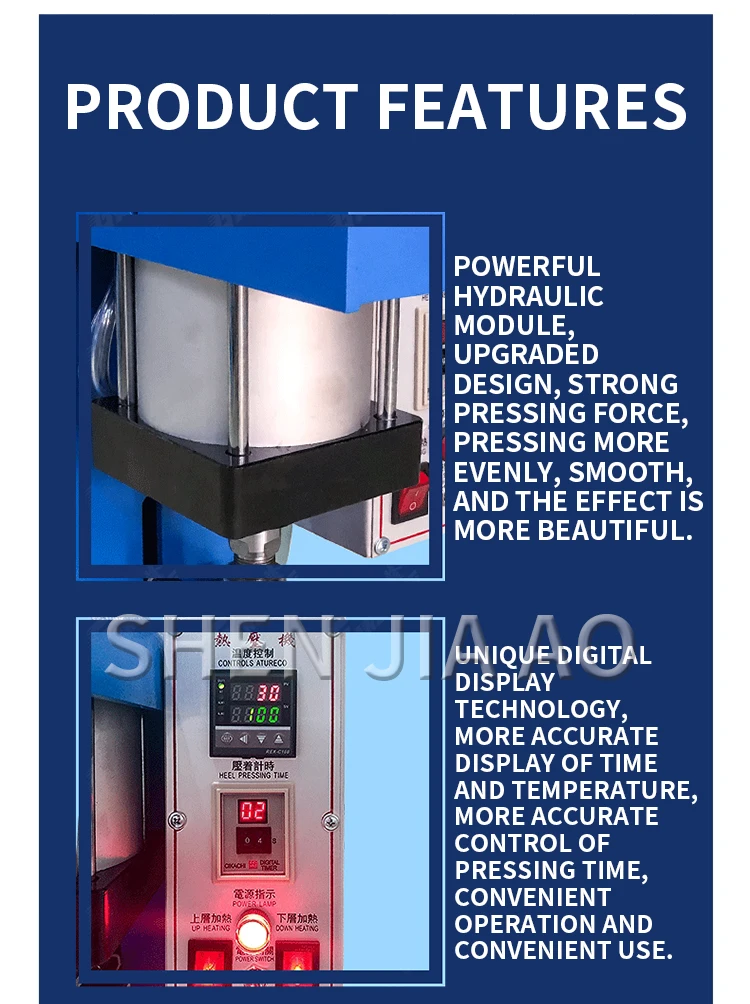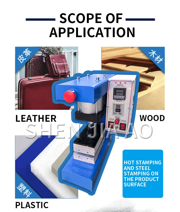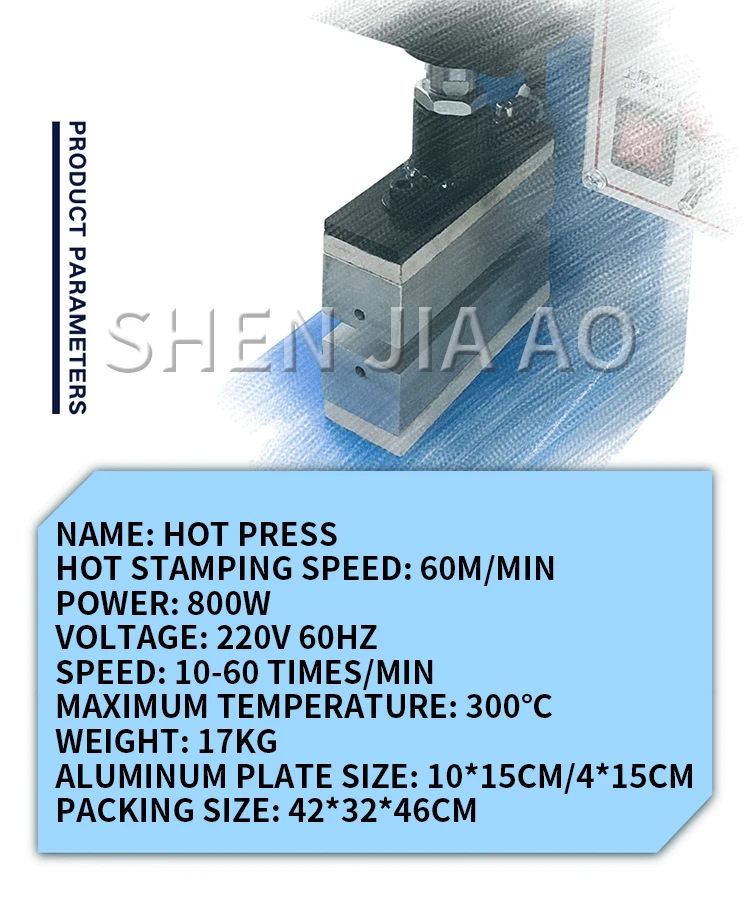 Name: Hot Press Hot stamping speed: 60m/min Power: 800W Voltage: 220V 60Hz Speed: 10-60 times/min Maximum temperature: 300℃ Weight:20kg Aluminum plate size: 10*15cm/4*15cm Packing size: 42*32*46cm