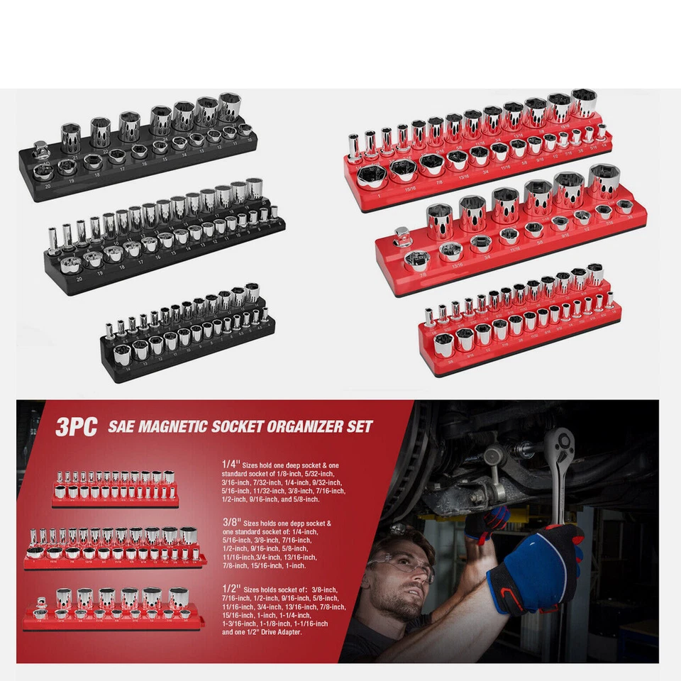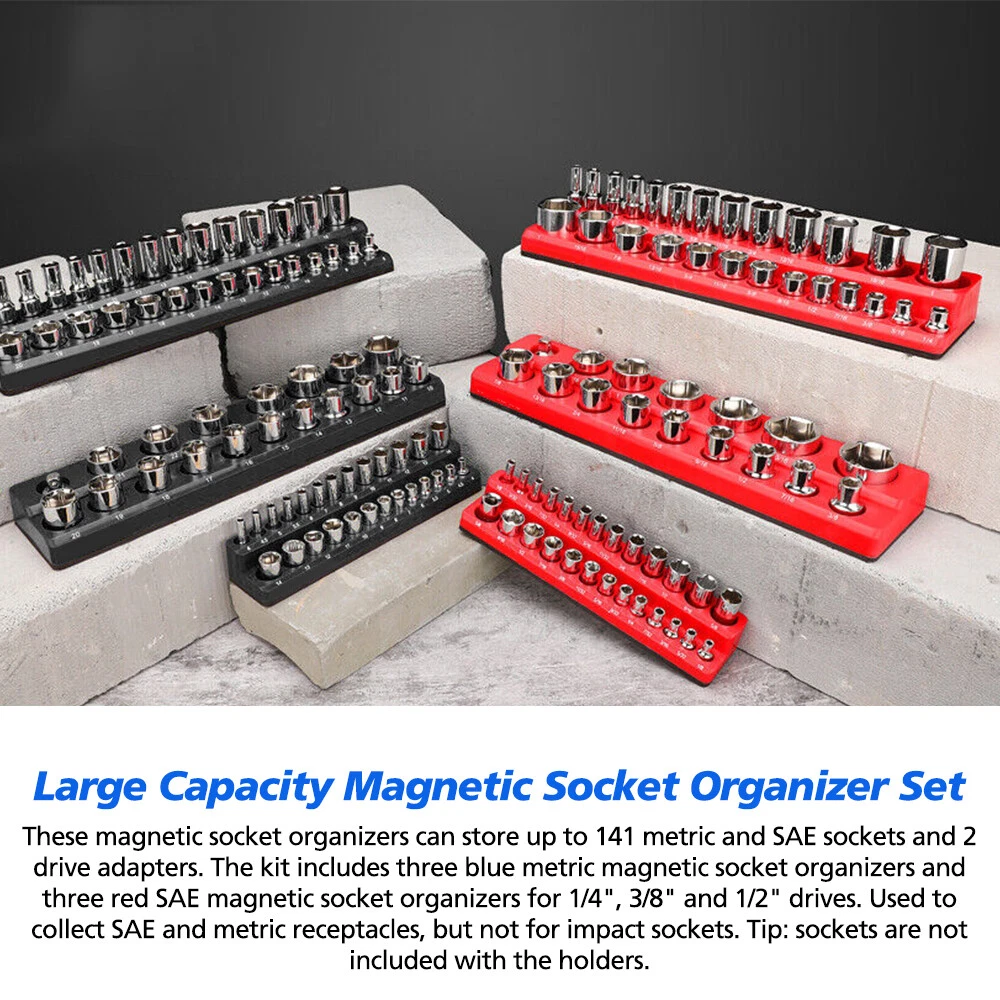 Large Capacity Magnetic Socket Organizer Set: These magnetic socket organizers can store up to 141 metric and SAE sockets and 2 drive adapters. The kit includes three black metric magnetic socket organizers and three red SAE magnetic socket organizers for 1/4", 3/8" and 1/2" drives. Used to collect SAE and metric receptacles, but not for impact sockets. Tip: sockets are not included with the holders.