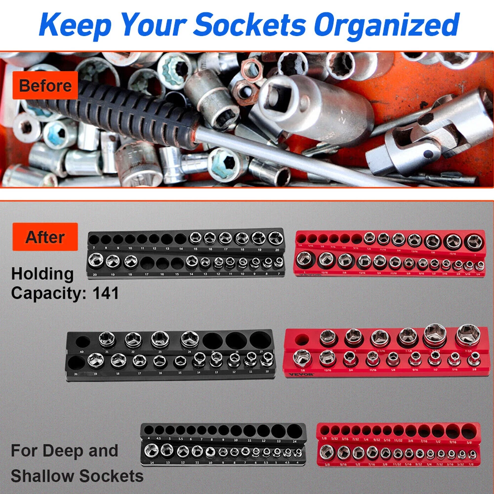 Keep Your Sockets Organized: Find the right socket quickly and easily with this magnetic socket holder set. Each tray comes with a legible label, so you can tell which slot to grab at a glance. Instead of finding the socket you want in a disorganized toolbox like before.