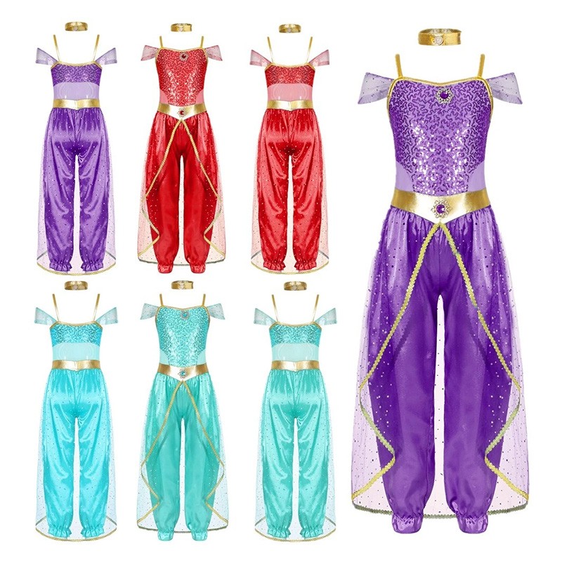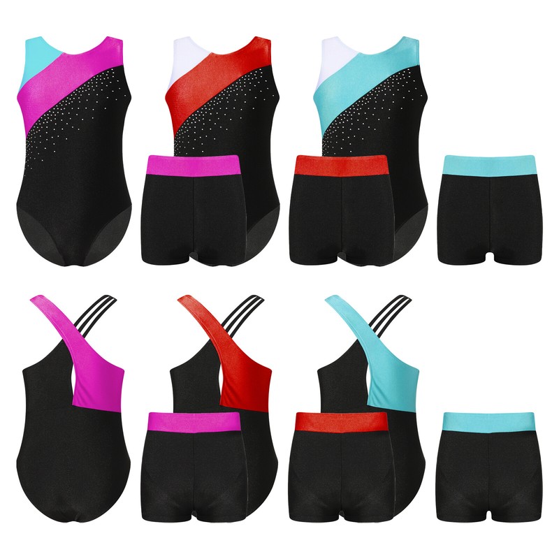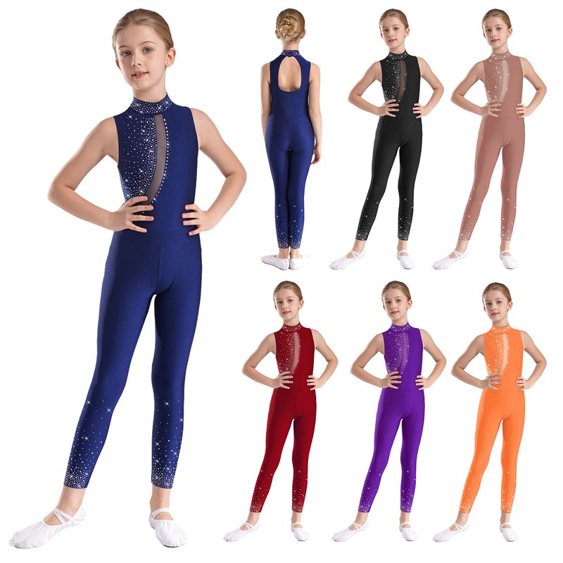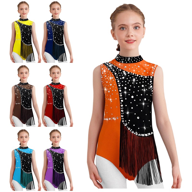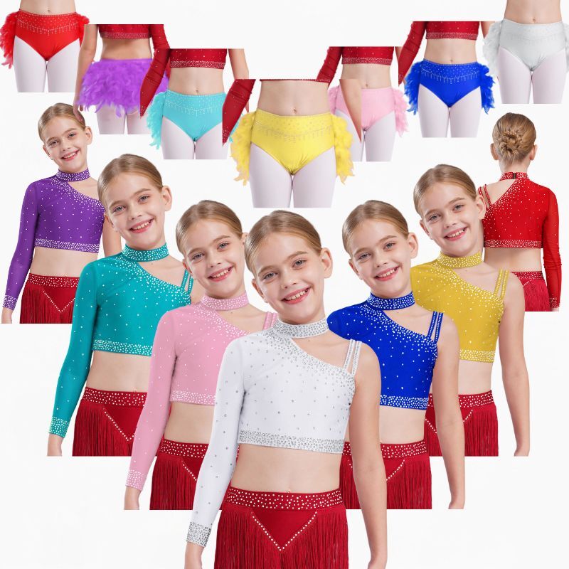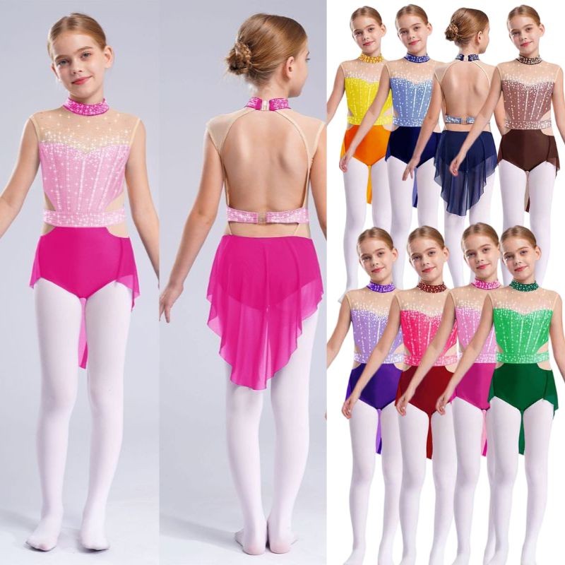 Kids girls’ lyrical dance performance outfit with rhinestones that sparkle under the light to brighten up any performance.