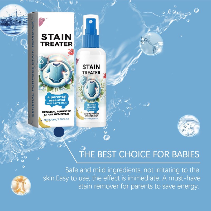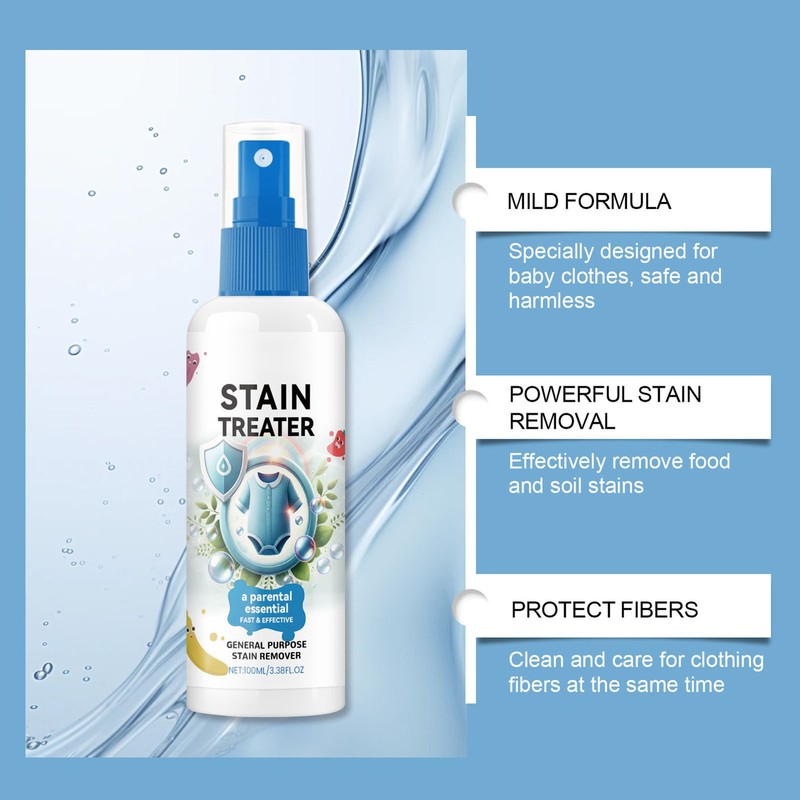 The Baby Clothes Stain Remover is a 100ml travel-size detergent agent designed for toddler care. It effectively cleans milk, food, grease, and oil stains from clothing made of cotton, linen, or other fabrics, including underwear. This cleaning solution is ideal for parents seeking to maintain their child's garments in pristine situation while traveling or at home.