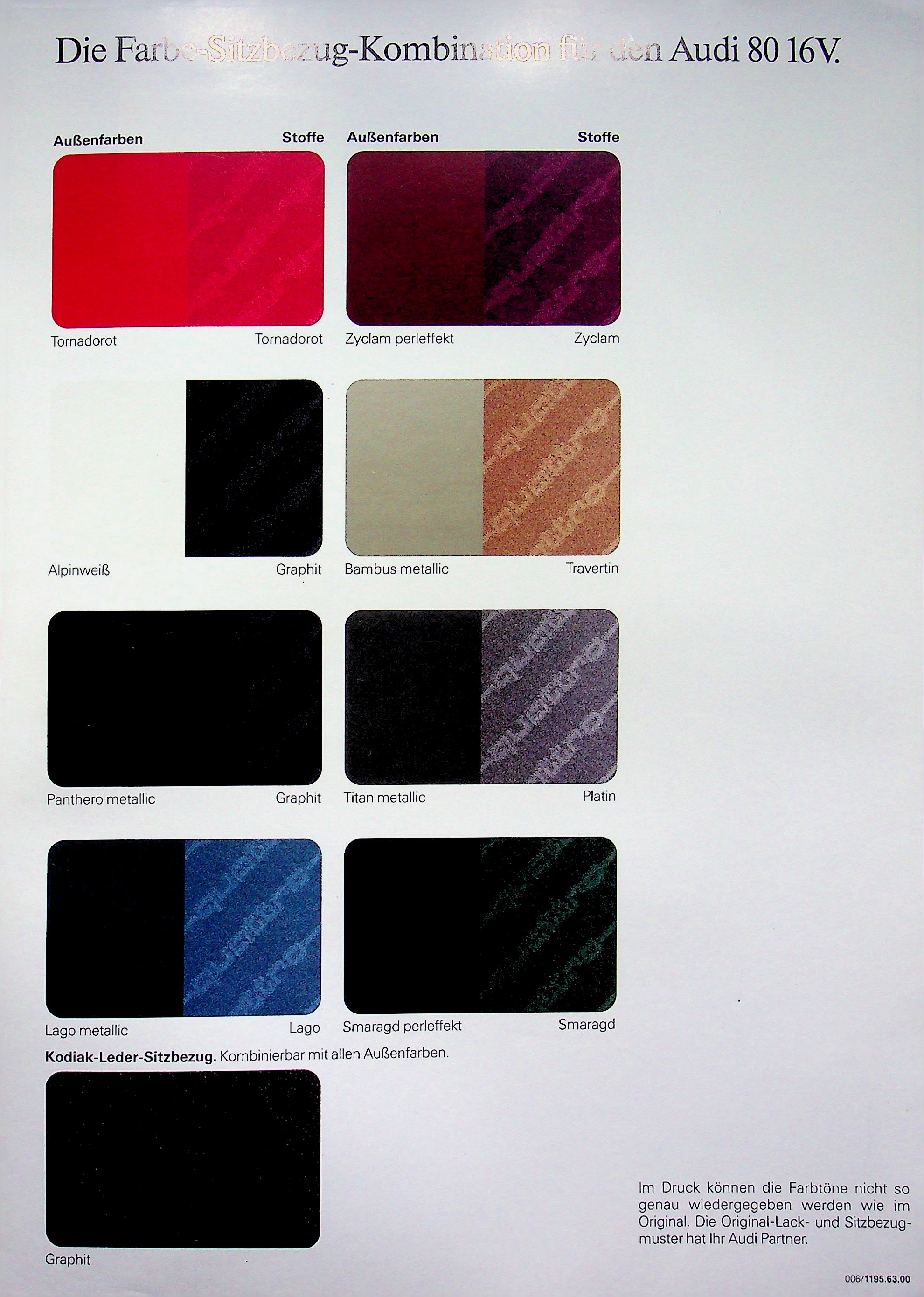 Wir bieten Ihnen ein 1 Seiten starkes, deutschsprachiges Audi 80 16V - Farben & Polster - Prospekt aus dem Jahr 198? an.