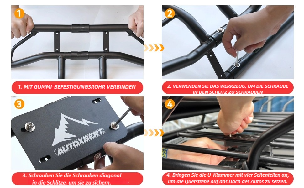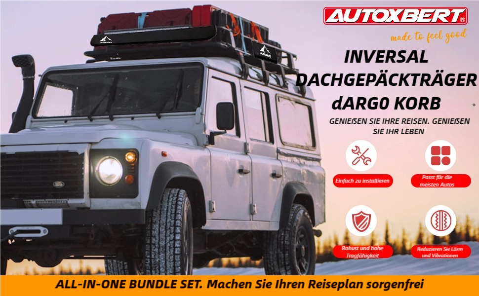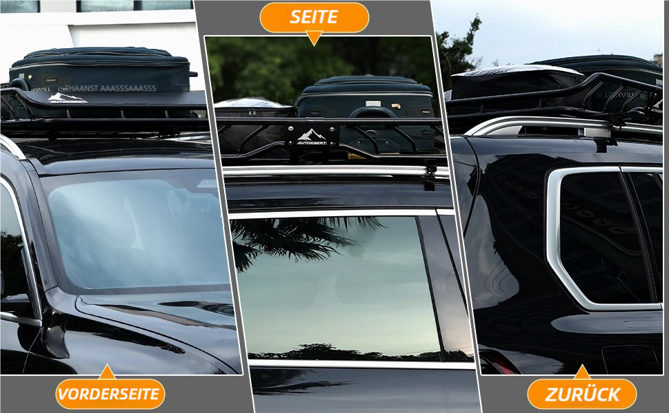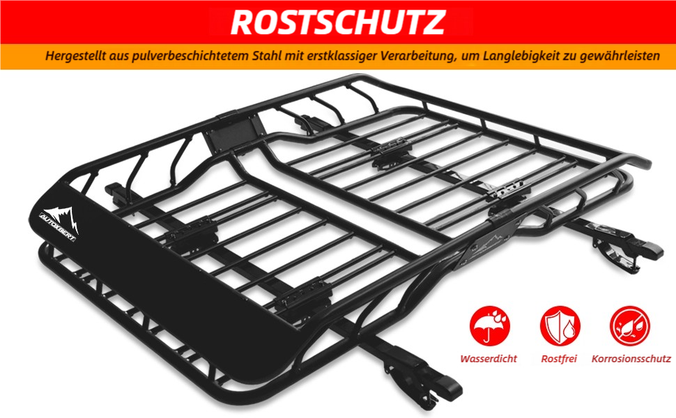 AUTOXBERT Dachgepäckträger-Gepäckkorb mit Dachgepäckträger. Unser Produkt ist dank seines verstellbaren Designs mit den meisten Fahrzeugen mit erhöhten Schienen kompatibel und passt zwischen 4.96" und 43,31" (126-1100 mm) von Bolzenloch zu Bolzenloch, was bei den meisten SUVs der Fall ist. Die Montage an Ihrem Auto ist ganz einfach. Befestigen Sie einfach die mitgelieferten Halterungen an den Dachreling Ihres Autos. Kein Bohren oder Schneiden erforderlich! Erwähnenswert ist auch seine robuste Konstruktion aus hochbelastbarem Stahl, die für zuverlässige und langlebige Leistung sorgt, den Luftwiderstand minimiert und für Sicherheit und bessere Aerodynamik sorgt.