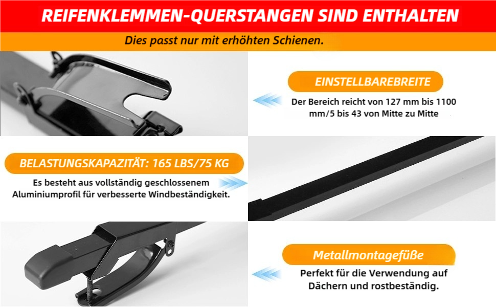Maximale Tragkraft des Dachgepäckträgers mit mitgelieferter Querstange: 165 lbs/75 kg