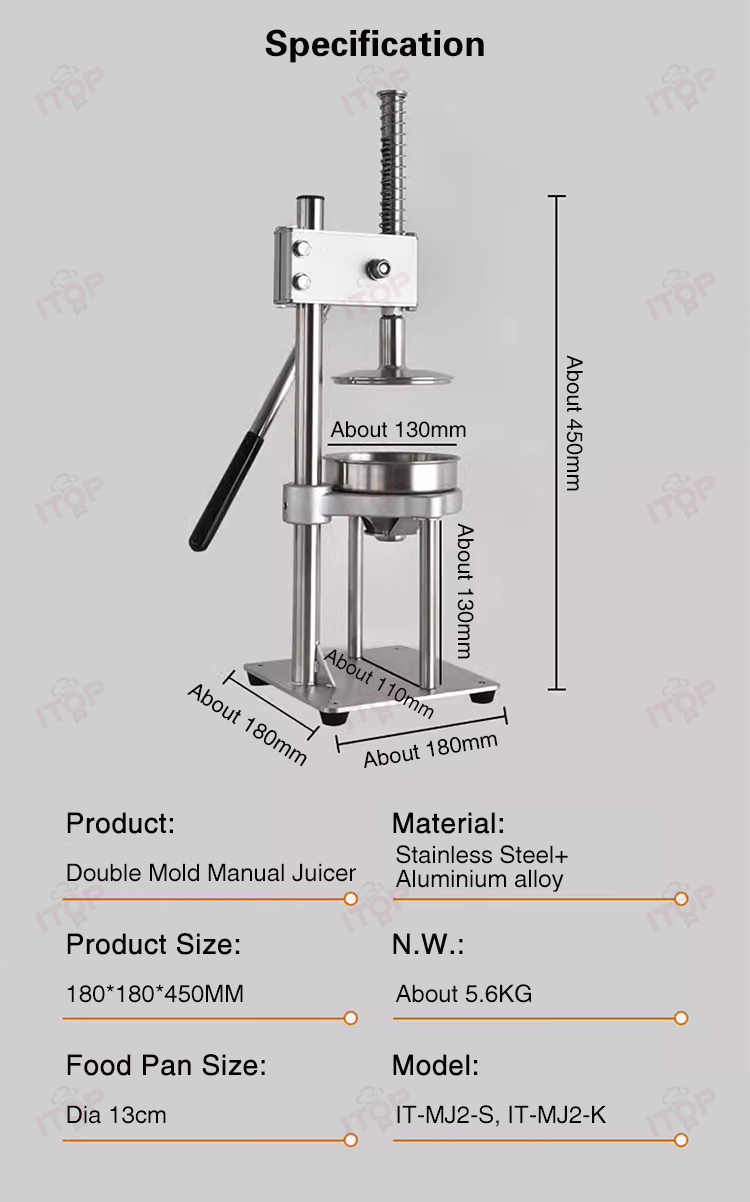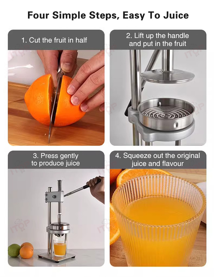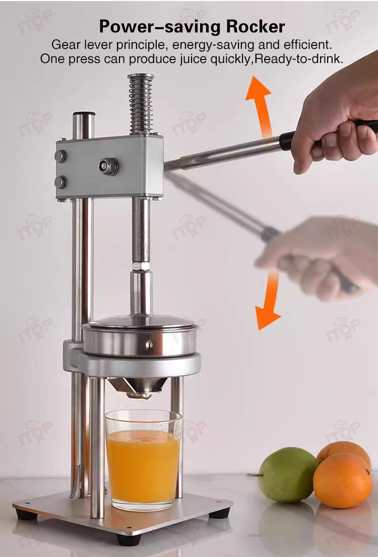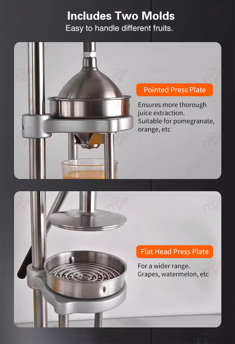 ·Pointed press plate. Ensures more thorough juice extraction. Suitable for pomegranate, orange, etc