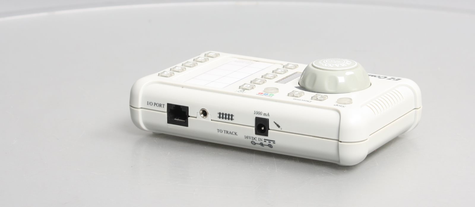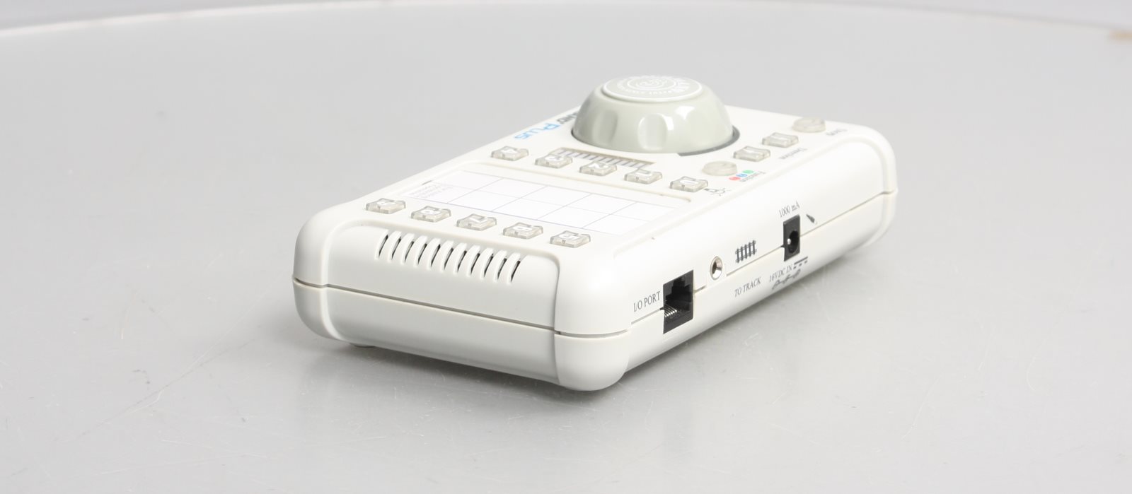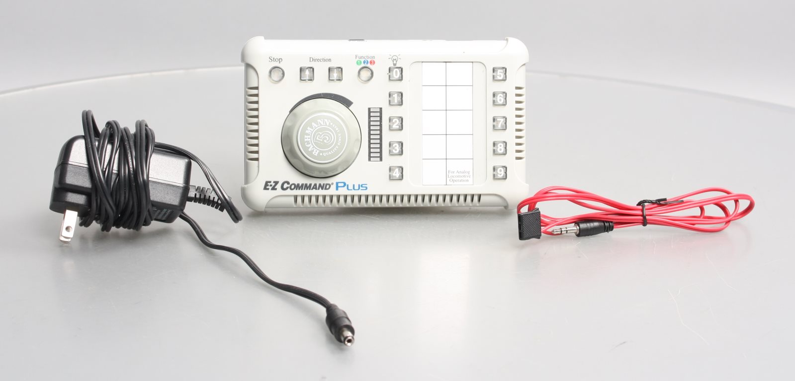 This is a Bachmann 44933 E-Z Command Plus DCC Controller System. Features: digital control of multiple locomotives in all scales (E-Z Command 5 Amp Power Booster, Item No. 44910, required for O and Large Scale operation), digitally control speed, direction, lighting, and sound, on-track programming, 128 speed step locomotive control, LED speed indicator display, both individual locomotive and full-track emergency stop buttons, up to 29 control functions, Bachmann E-Z Command DCC-equipped turnout control, wall pack power supply, plug-in wiring.