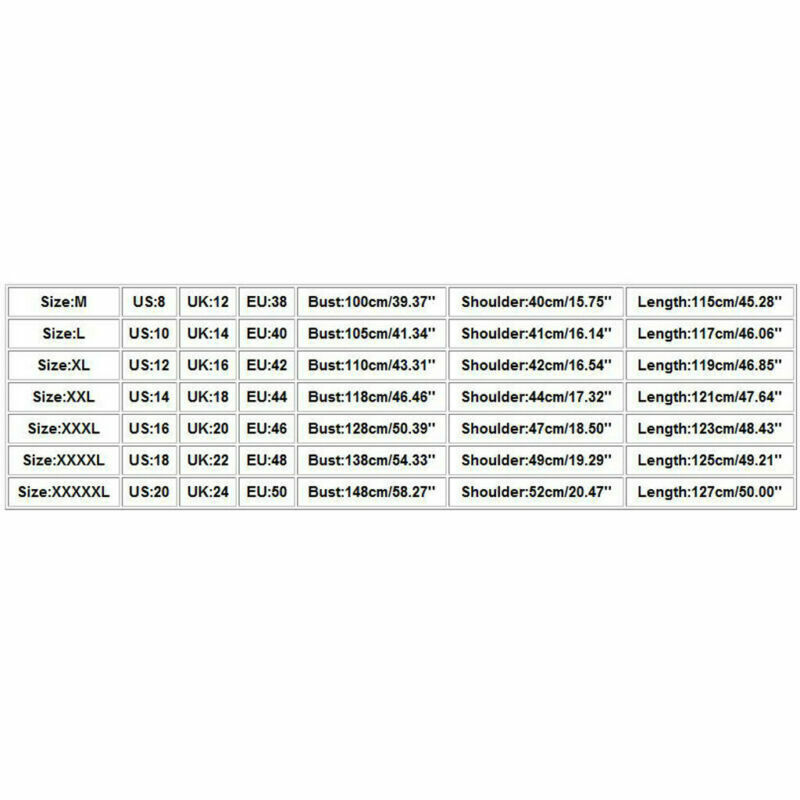 | Size:XXXXXL | US:20 | UK:24 | EU:50 | Bust:130cm/51.18'' | Shoulder:52cm/20.47'' | Length:127cm/50.00'' |