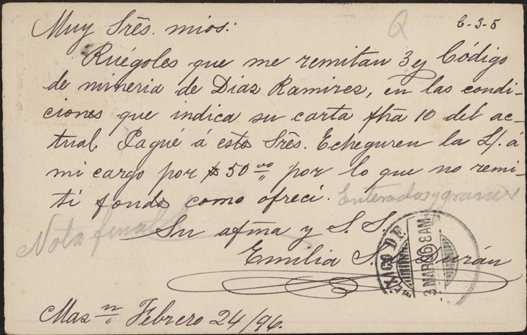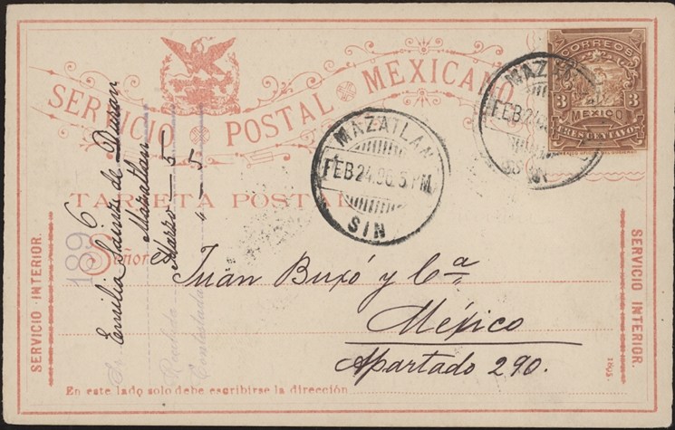 Mexico, 1896. Post Card, Mepsi PC 75, sent to Mexico City. Tied by Mazatlan cancels Feb 24 96. Reverse with Mexico receiver 3 Mar 96. F-VF.