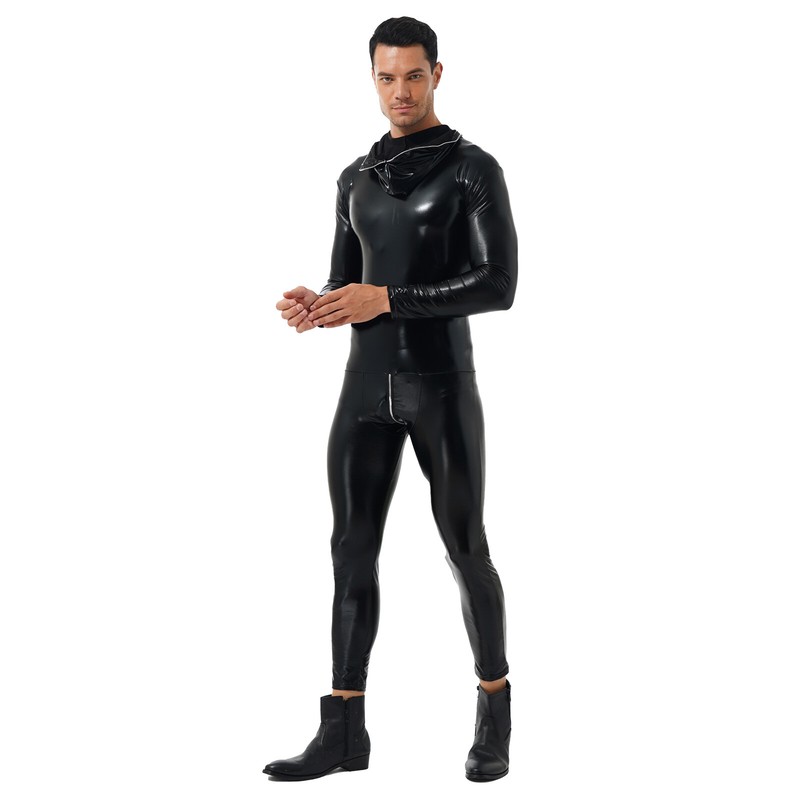 Men Zipper Back Patent Leather Hooded Bodysuit Stretchy Skinny Jumpsuits Nightclub Stage Performance Costume.
