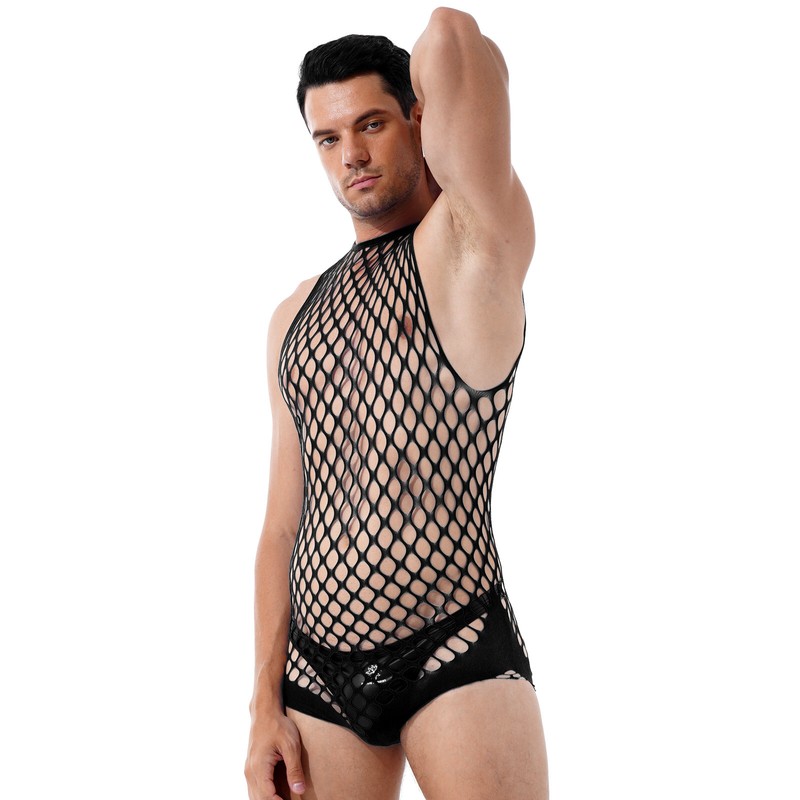 Men One-piece Hollow Out Netted Bodystockings Lingerie Halter Neck Sleeveless See-through Stretchy Bodysuits Nightwear.