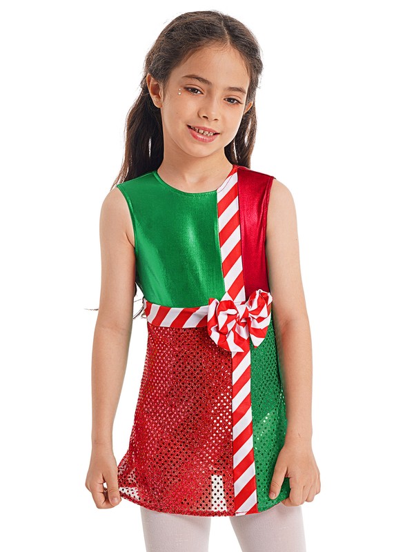 Metallic bronzing cloth, striped patchwork, red and green color block, bring your girls into Christmas atmosphere.