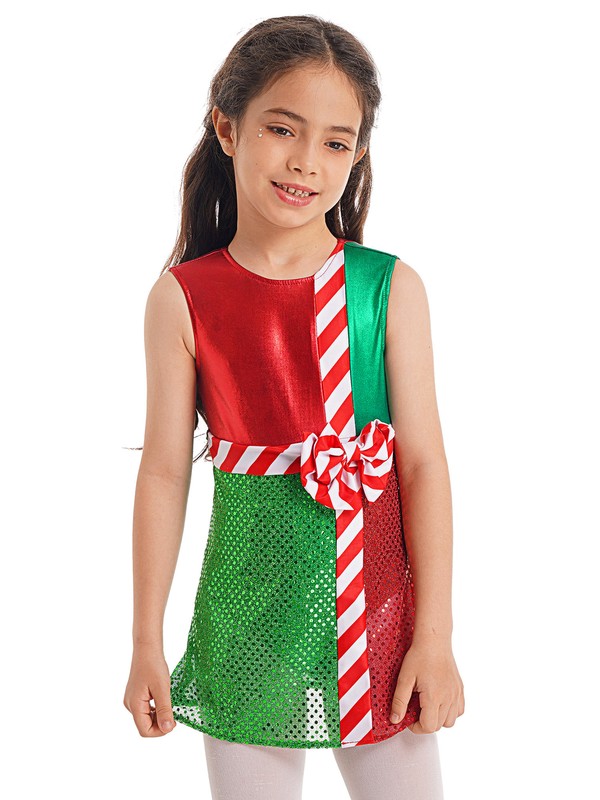 Kids girls striped color block Christmas dress up sleeveless back cutout shiny layer skirt jumpsuit stage costumes.
