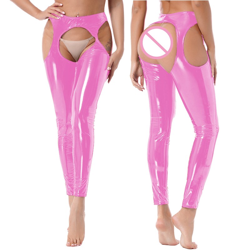 Womens Wet Look High Waist Cutout Leggings Crotchless Open Butt Patent Leather Skinny Pants.