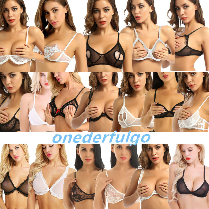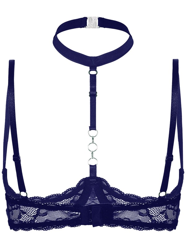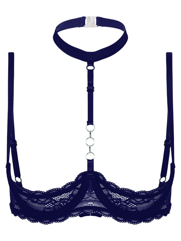 Womens 1/4 Cups Underwire Bra Halter Neck O Ring Sheer Lace Push Up Brassiere Underwear.