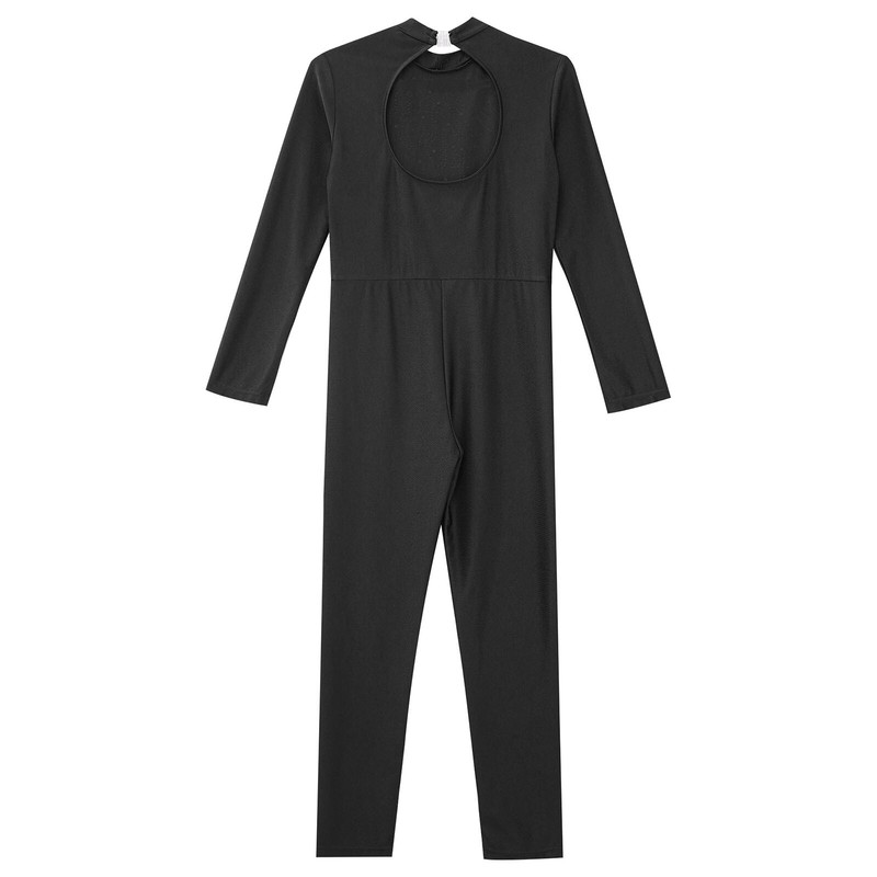 Long sleeve full length leotard for girls, keyhole back, mock neck with an a buckle for easy wearing and taking off.