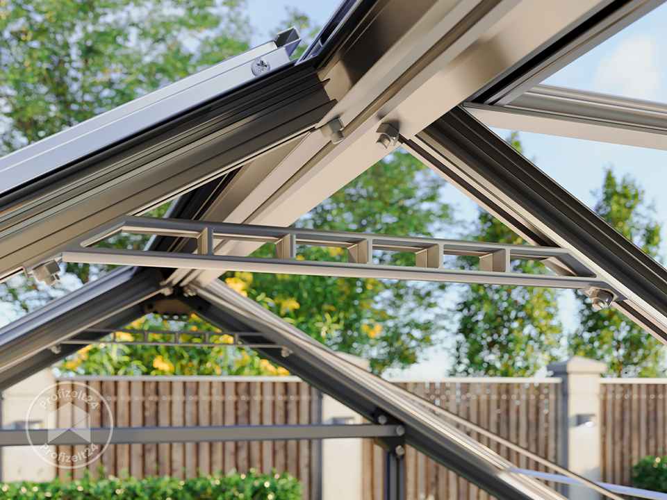 STABILER ALU-RAHMEN: besonders robuste Konstruktion aus rostfreiem Aluminium, Verstärkungen gegen Wind an allen Seiten, mit Regenrinnen und Dachfenster