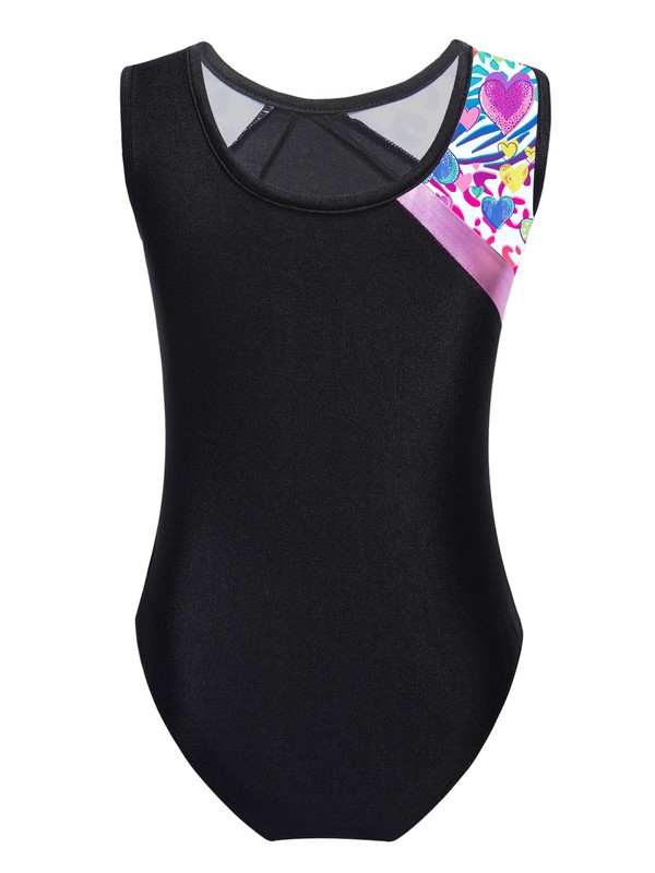 Sleeveless, round neckline leotard is adorned with rhinestones, patchwork printed style.
