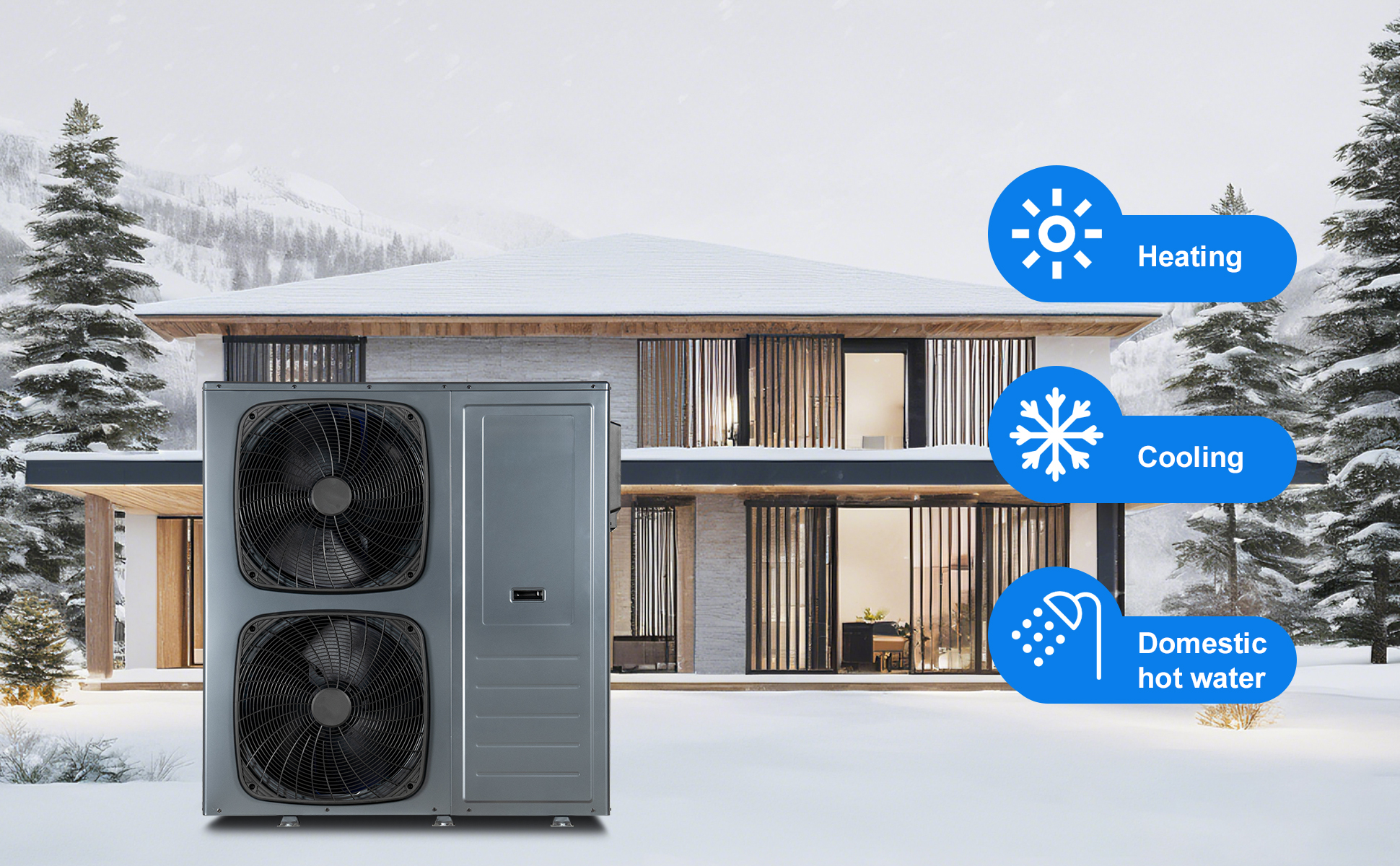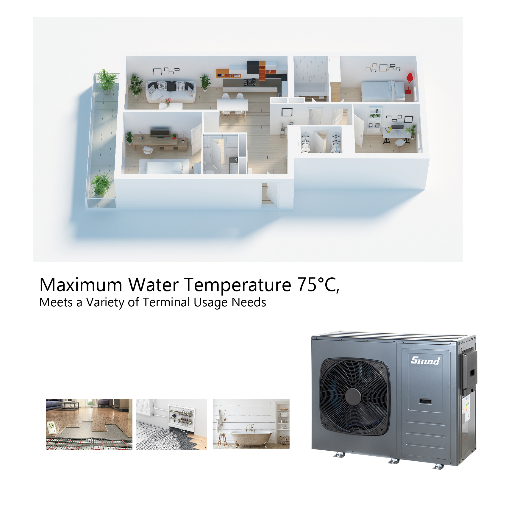 Die Mono-Wärmepumpe von Smad bietet Heizung, Kühlung und Warmwasserbereitung in einer einzigen Lösung, die in Villen, Geschäftsgebäuden, ländlichen Eigenheimen, Bürogebäuden, Hotels, in der Kosmetikindustrie und an anderen Orten eingesetzt werden kann.