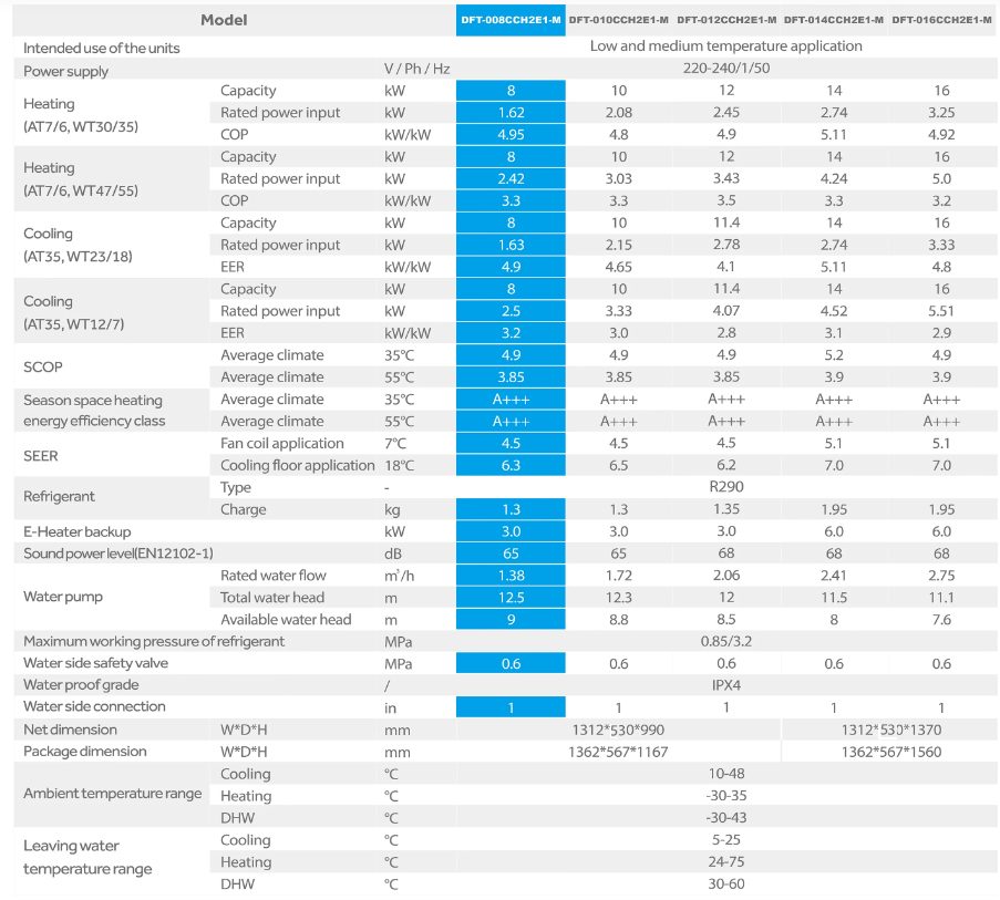 Diese Wärmepumpe kann den Bedarf des Nutzers an Heizung im Winter, Kühlung im Sommer und Warmwasserbereitung das ganze Jahr über decken. Sie kann im Heiz-, Kühl- und Warmwassermodus separat betrieben werden, und sie kann auch im gemischten Modus Heizung + Warmwasser und Kühlung + Warmwasser arbeiten.