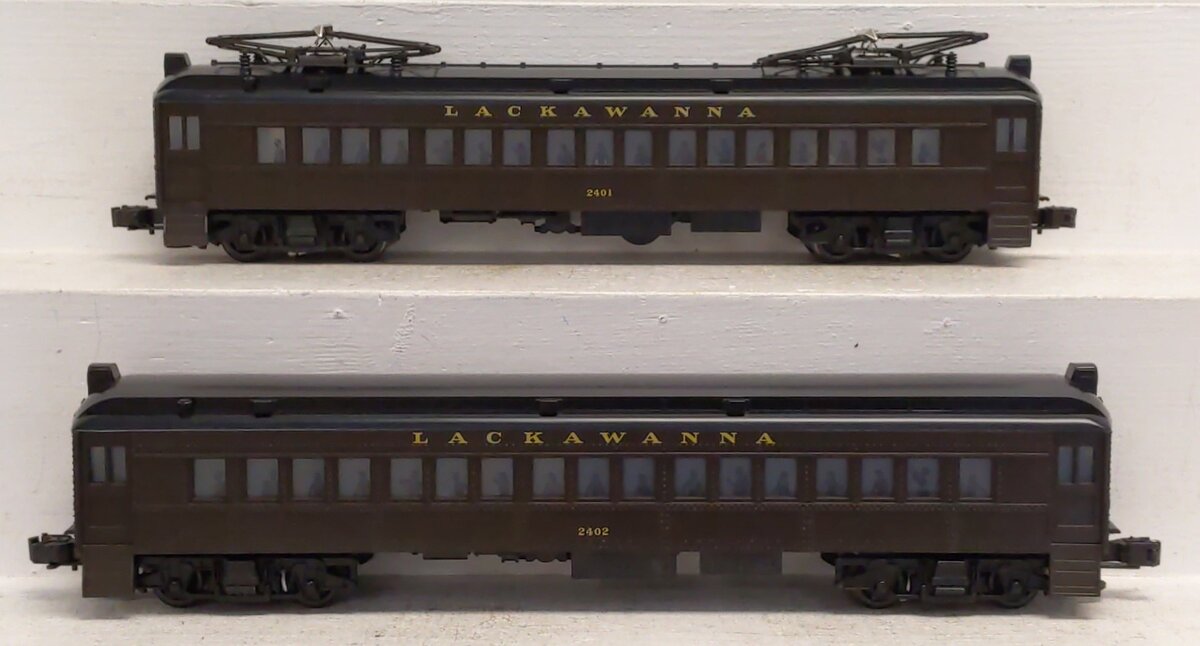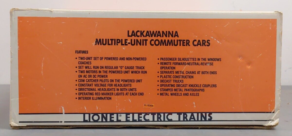 Here is a Lionel 6-18304 O Gauge Lackawanna Multiple-Unit Powered Commuter Cars Set. One car is powered and the other in the set is a dummy. The powered item features directional headlights, die-cast trucks, lighted interior, operating die-cast knuckle couplers, passenger silhouettes in the windows, operating red marker lights at each end, separate metal chains at each end, and two stamped metal non-operating pantographs.
