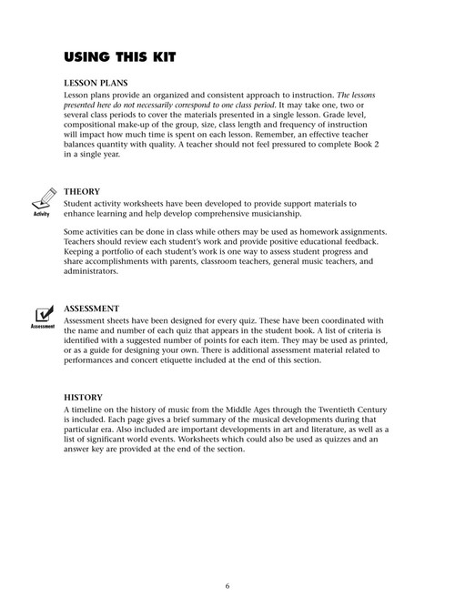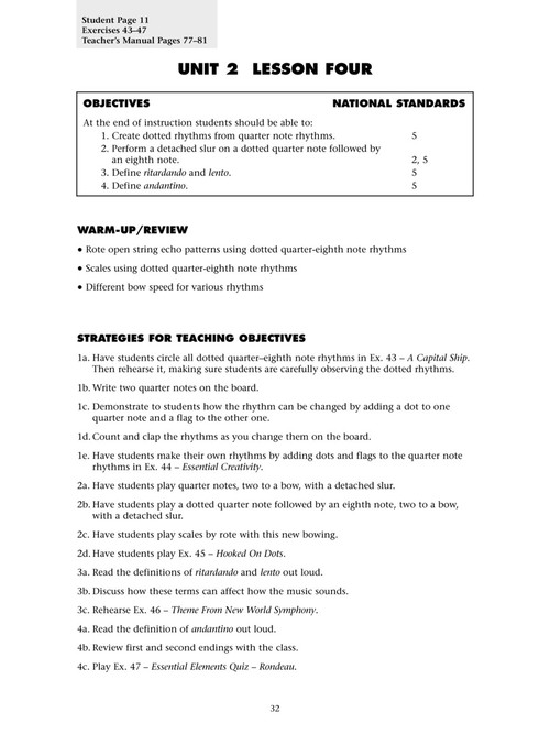 This valuable source of support materials includes lesson plans, reproducible student activity pages and much more on CD-ROM. It's all designed to help you get the most out of your Essential Elements experience. Over 40 Lesson Plans Correlated to Essential Elements 2000 for Strings - Book 2 and organized into three parts: - Learning Objectives - Teaching Strategies - Assessment Reproducible Student Activity Pages These worksheets have been developed to provide support materials to enhance learning and help develop comprehensive musicianship. Some activities can be done in class, while others may be used as homework assignments; all pages are reproducible. Activities include: - Rhythm Studies - Creating Music - Music Theory - Listening Exercises - Quizzes All documents are available on the included CD-ROM. Lesson plans can be imported into any word processing program, allowing you to edit, personalize and print.