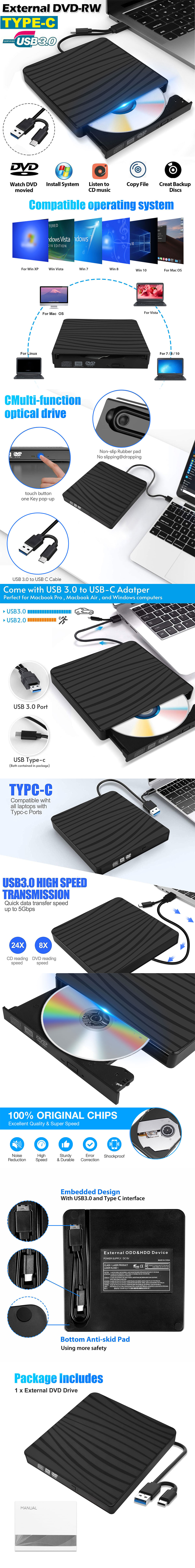 External DVD Drive USB 3.0 TYPE C Portable Disk Drive for Laptop Desktop PC Mac