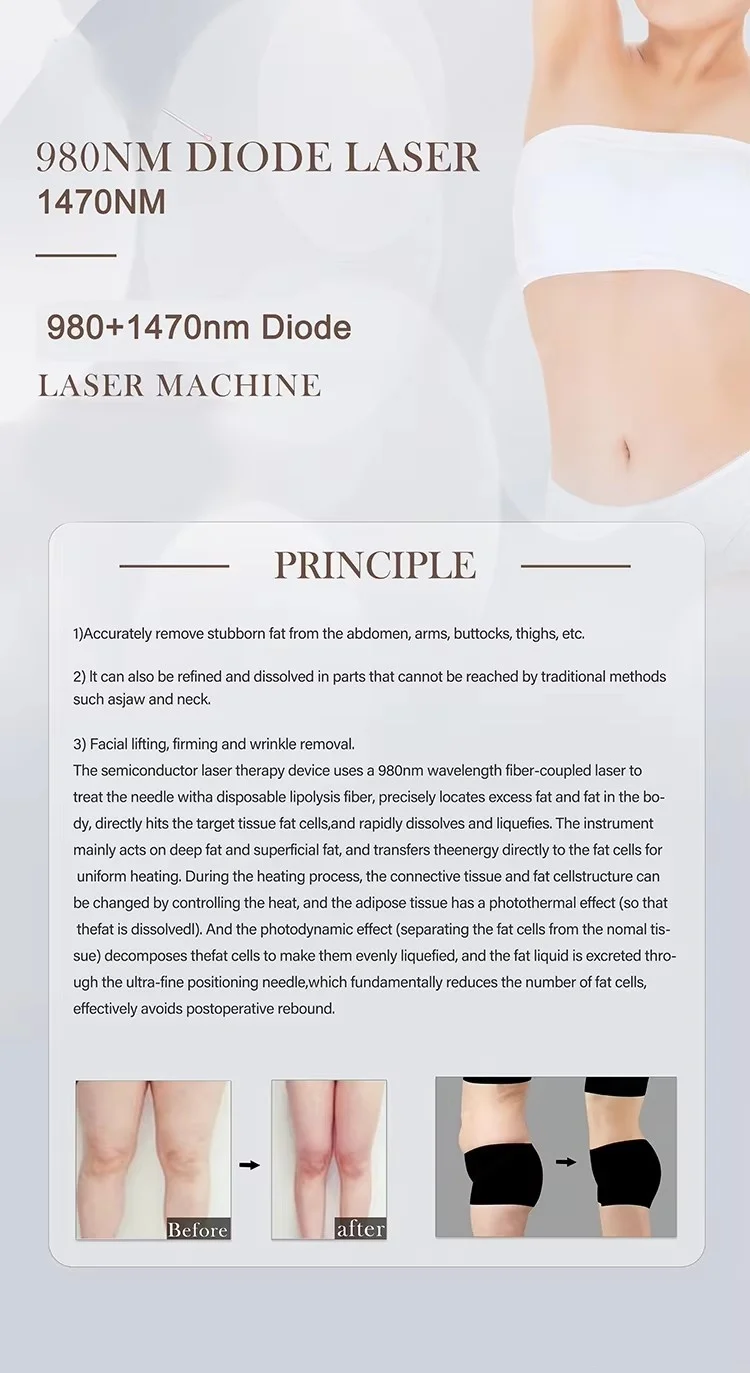 The semiconductor laser therapy device uses the 980nm and1470nm wavelength fiber-coupled laser to treat the needle with a disposable lipolysis fiber, precisely locates excess fat and fat in the body, directly hits the target tissue fat cells, and rapidly dissolves and liquefies. The instrument mainly acts on deep fat and superficial fat, and transfers the energy directly to the fat cells for uniform heating. During the heating process, the connective tissue and fat cell structure can be changed by controlling the heat, and the adipose tissue has a photothermal effect (so that the fat is dissolved). And the photodynamic effect (separating the fat cells from the normal tissue) decomposes the fat cells to make them evenly liquefied, and the fat liquid is excreted through the ultra-fine positioning needle, which fundamentally reduces the number of fat cells, effectively avoids postoperative rebound.