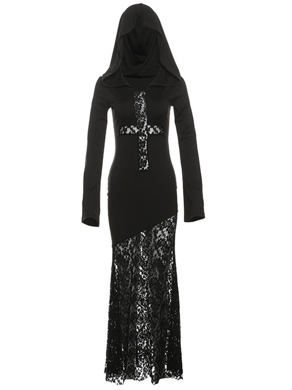 Womens Long Dress Transparent Dresses Renaissance Costume Cosplay Hooded Lace