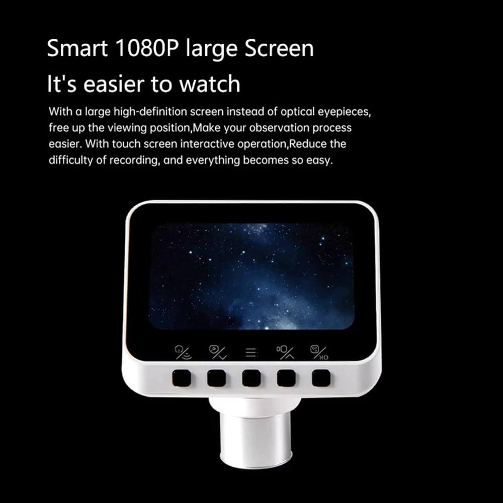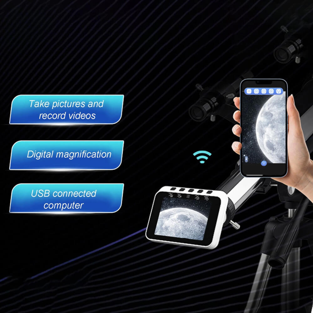 [1080P PHOTOGRAPHY AND VIDEO RECORDING] : This portable WiFi eyepiece features a 2.8in screen and 2MP lens, a CMOS sensor that supports still photos up to color 1080P and HD video recording, as well as timing and time lapse recording. By connecting the telescope camera to the app, you can link to your smartphone to share and control your shots