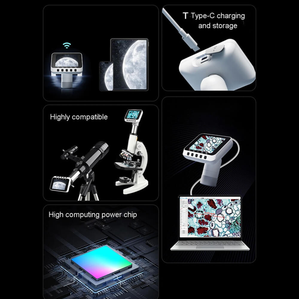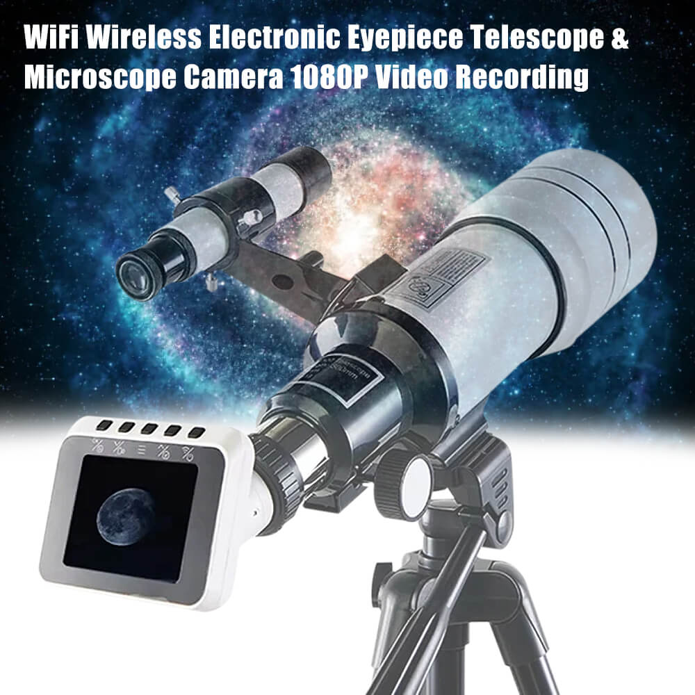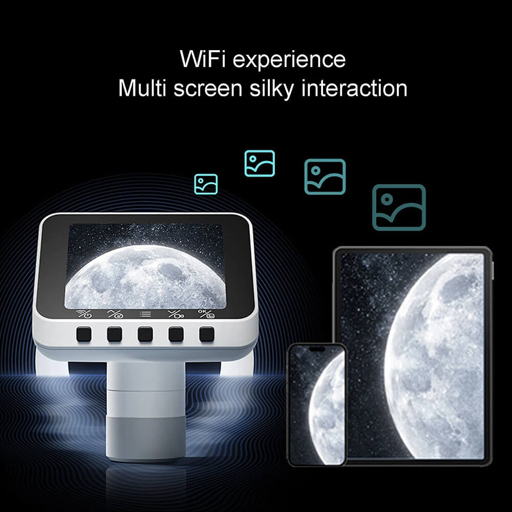 [EASY TO INSTALL] : This portable WiFi eyepiece can be easily mounted on an optical telescope or microscope. The electronic eyepiece comes with 1.25in, 0.965in telescope and 23.2mm microscope interfaces, and can be attached to a telescope or microscope device with a light rotating. Provides a basic way for beginners to easily observe astronomical scenes