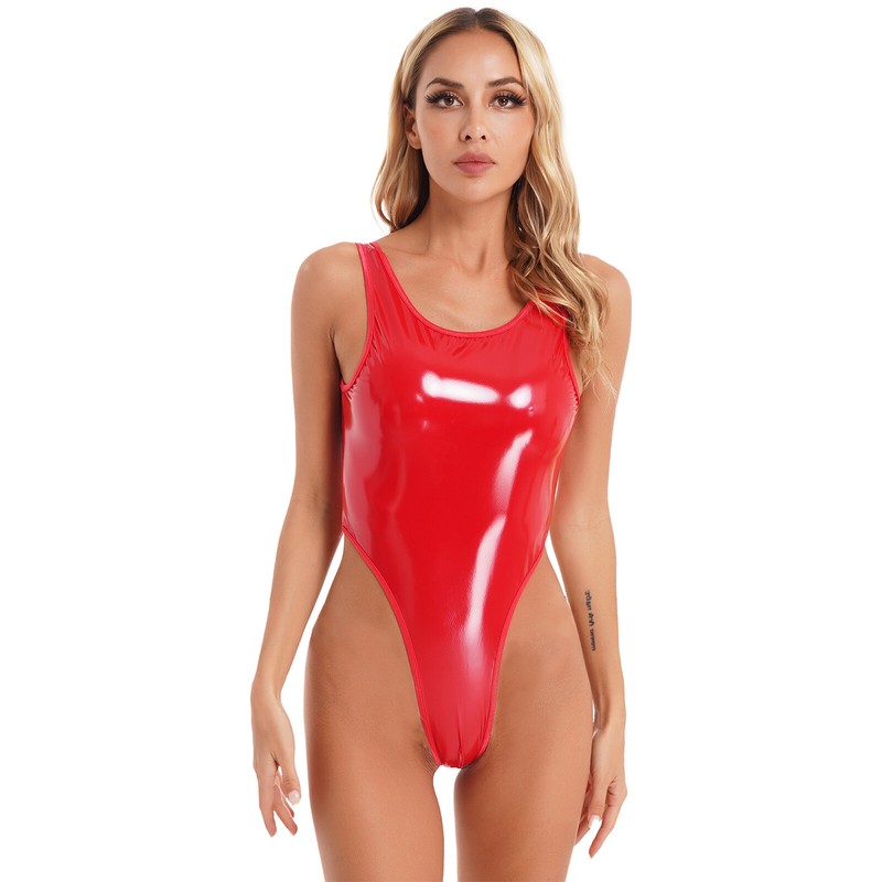 Womens High Cut Crotchless Patent Leather Bodysuit Wet Look Backless Sleeveless Leotard.