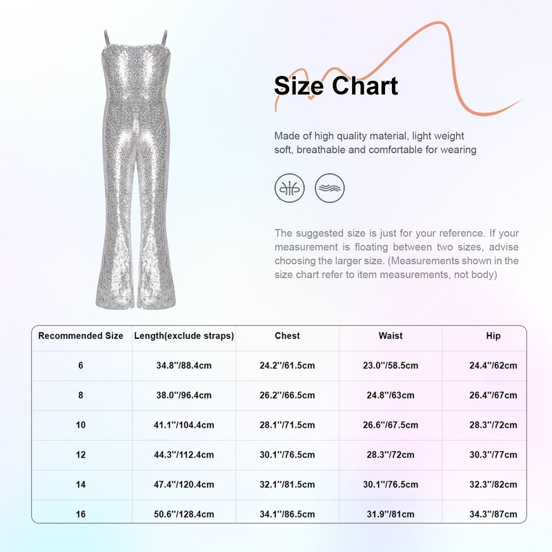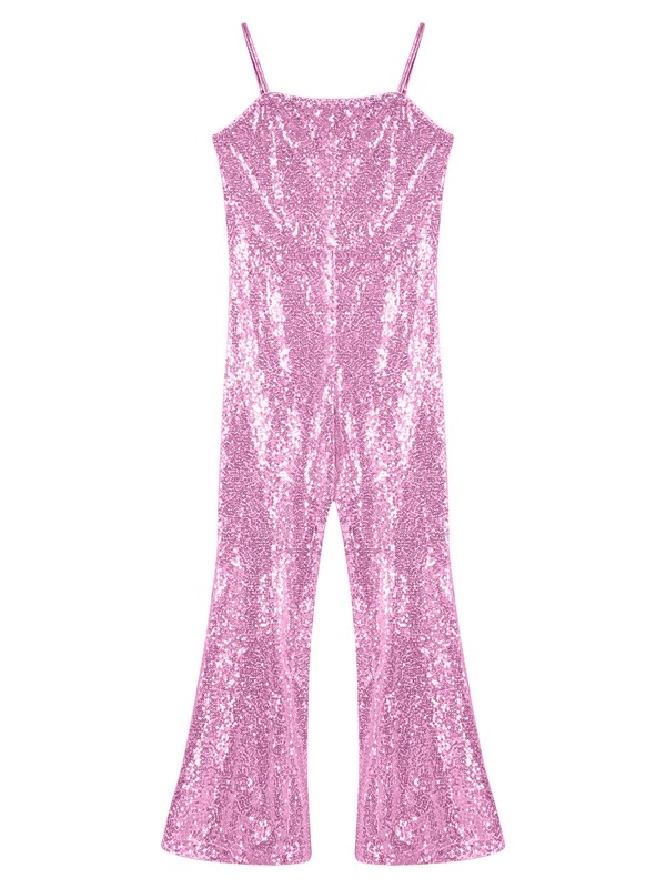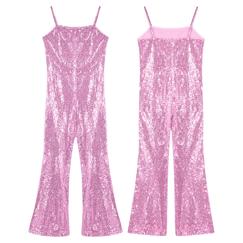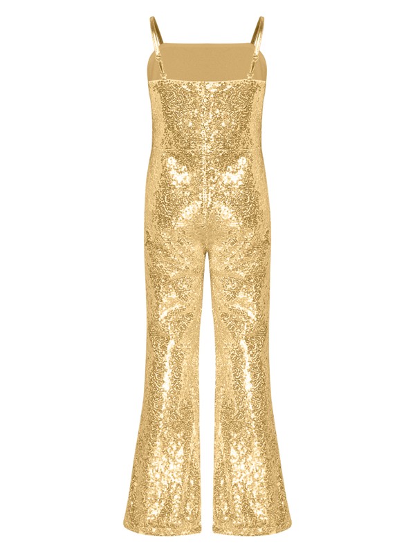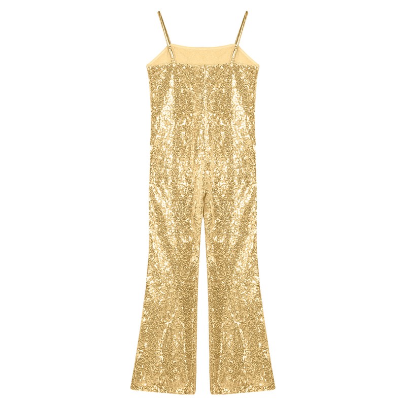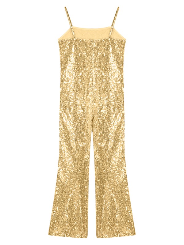 Allover shiny sequins make girls more eye-catching in the crowd. The bell bottoms jumpsuit is snug and slim fit.