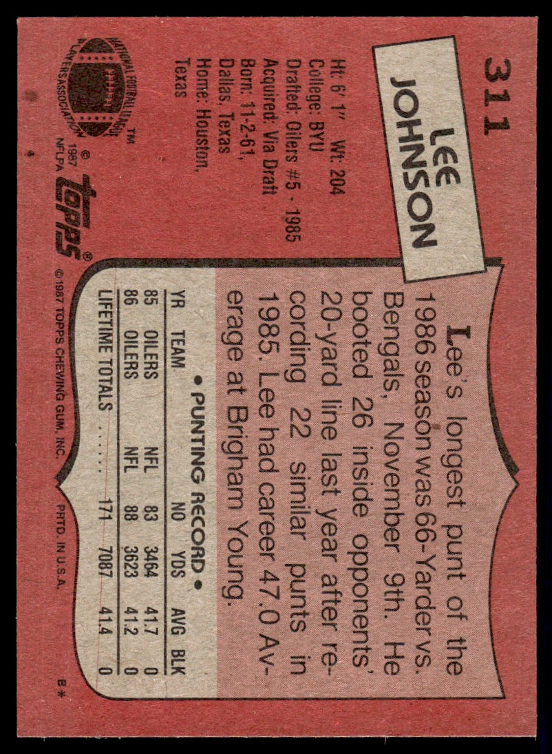 | 1987 Topps Lee Johnson Rookie Houston Oilers #311 |