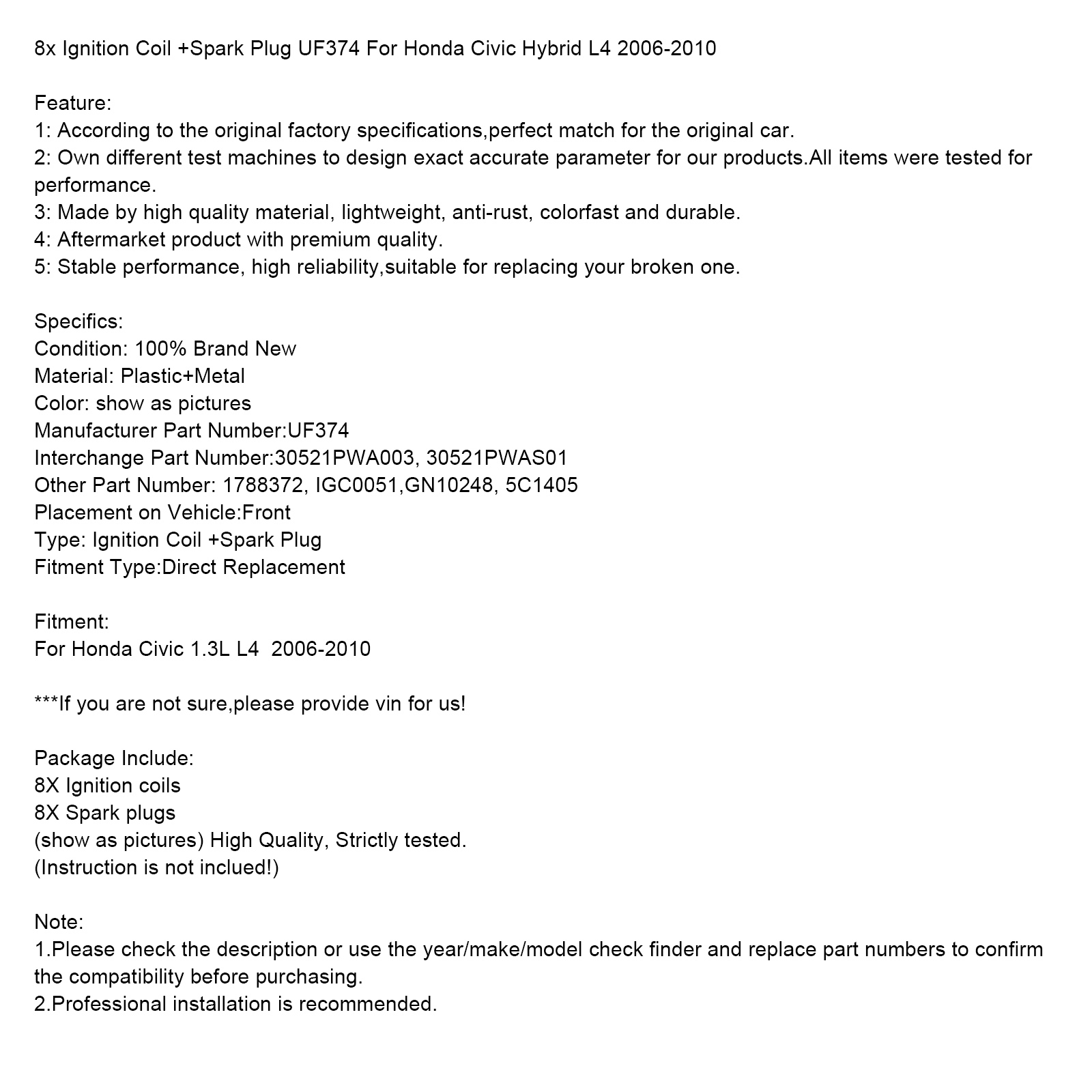 8x Ignition Coil +Spark Plug UF374 For Honda Civic Hybrid L4 2006-2010