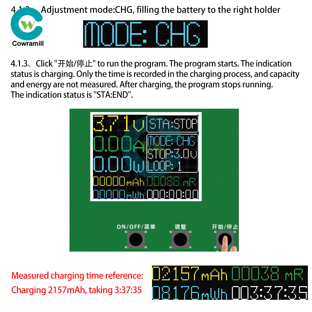 Install the battery in the battery holder, adjust the mode to "charging" mode, click "start/stop/R/S" to run the program; after the charging is finished, the status indication is complete; the charging process records the capacity, energy, charging time, charging metering capacity is for reference only, please take the discharging capacity as the standard