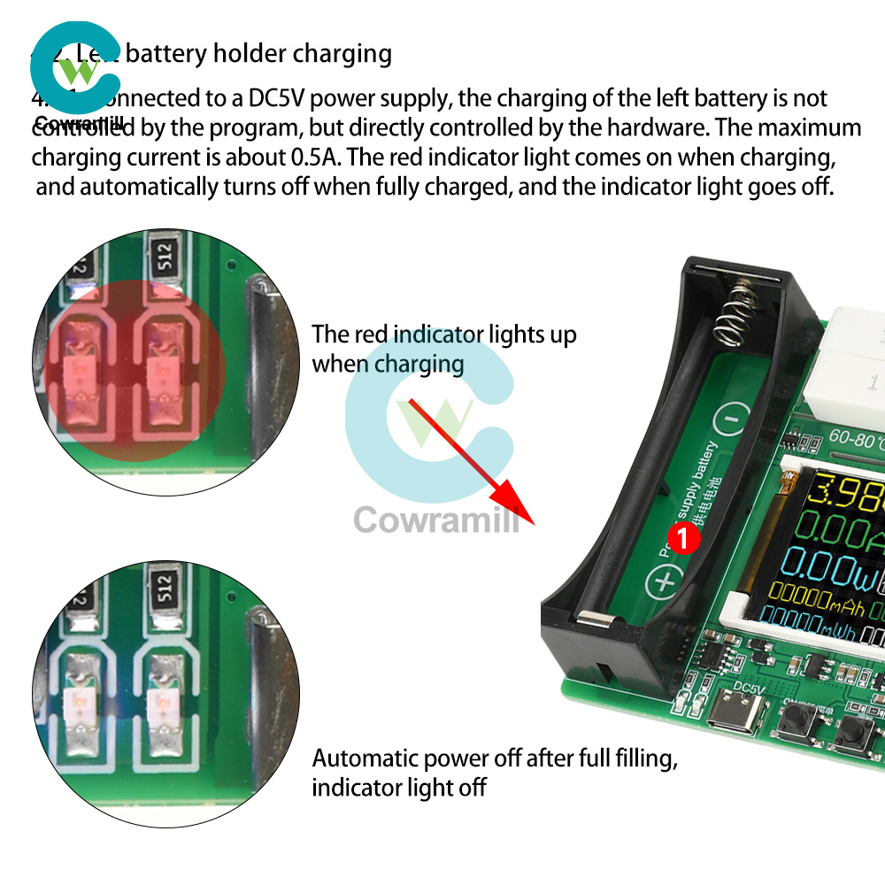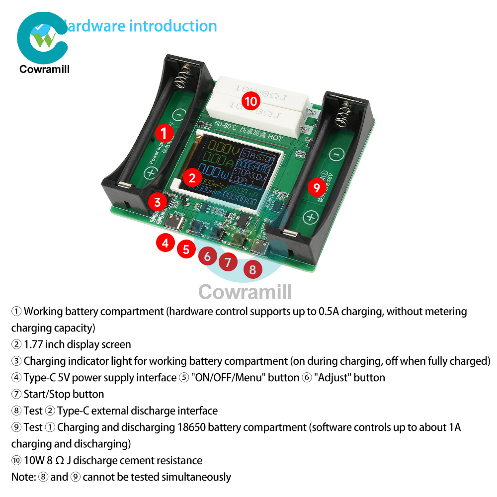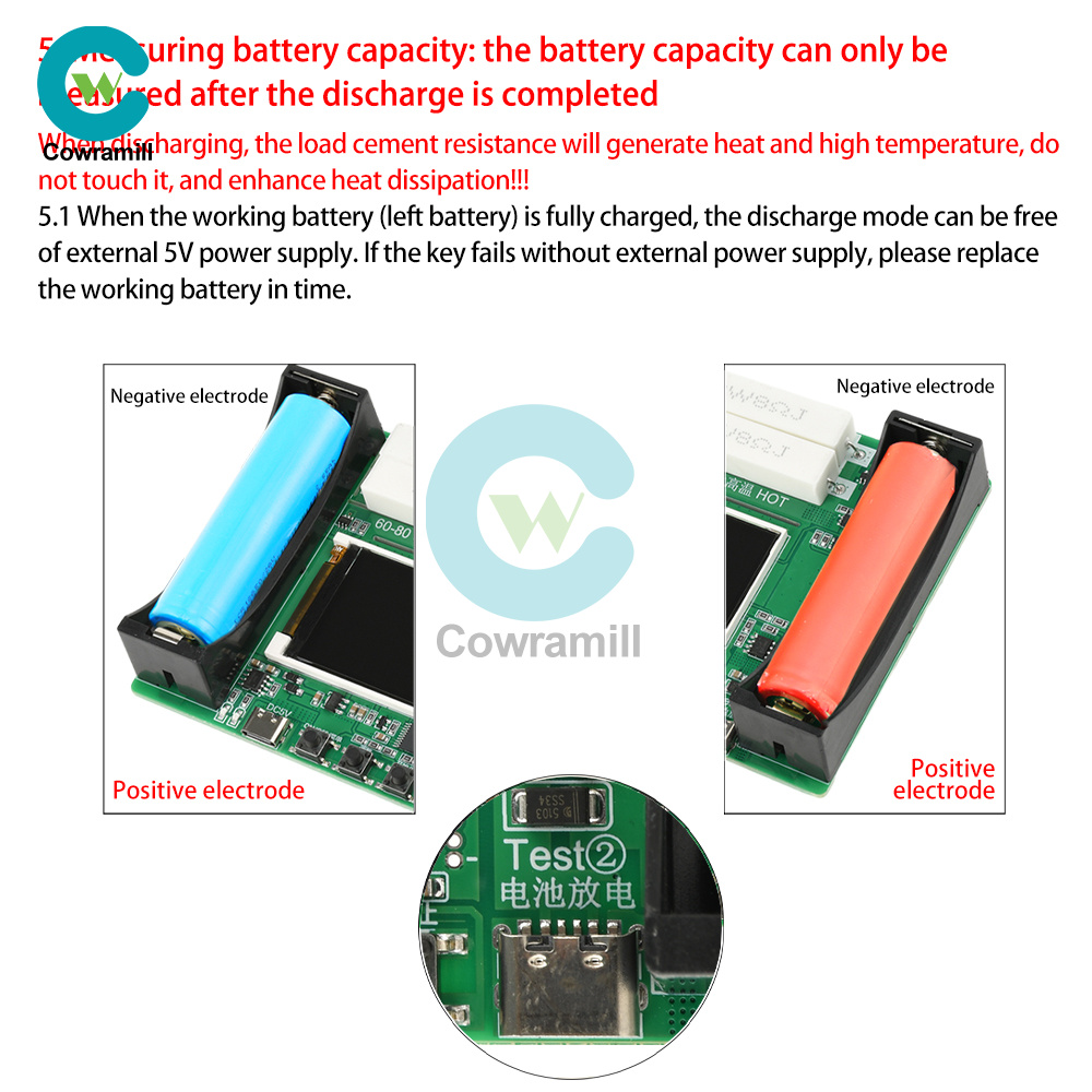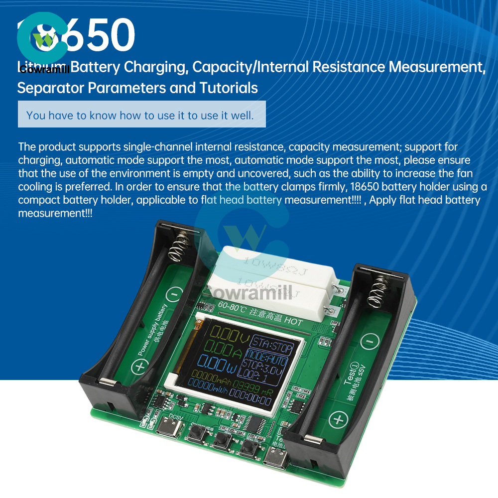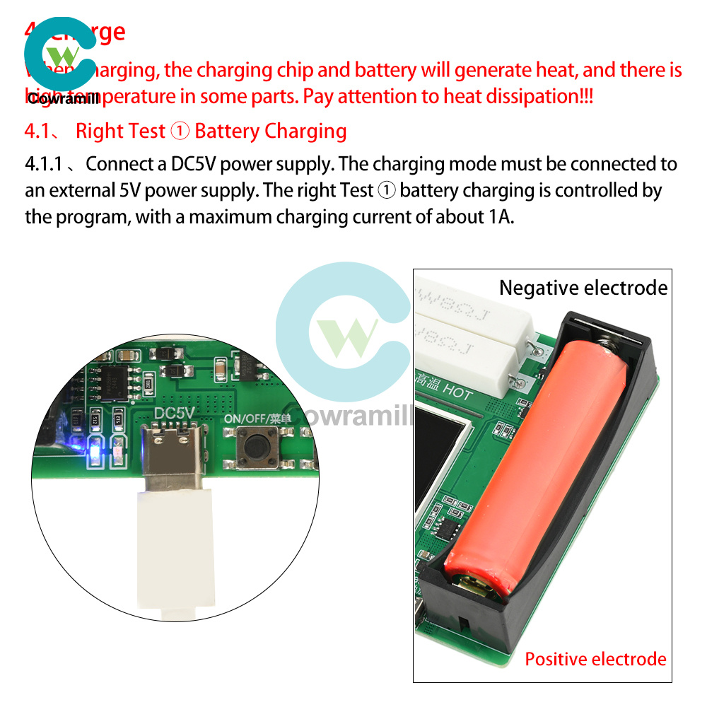Attention: During the charging and discharging process, some components may generate local high temperatures. Please ensure that the use environment is open and uncovered, and it is best to increase fan heat dissipation. To ensure the firmness of the battery clamp, the 18650 battery holder uses a compact battery holder suitable for flat head battery measurement!!! Lithium iron phosphate battery charging is not supported