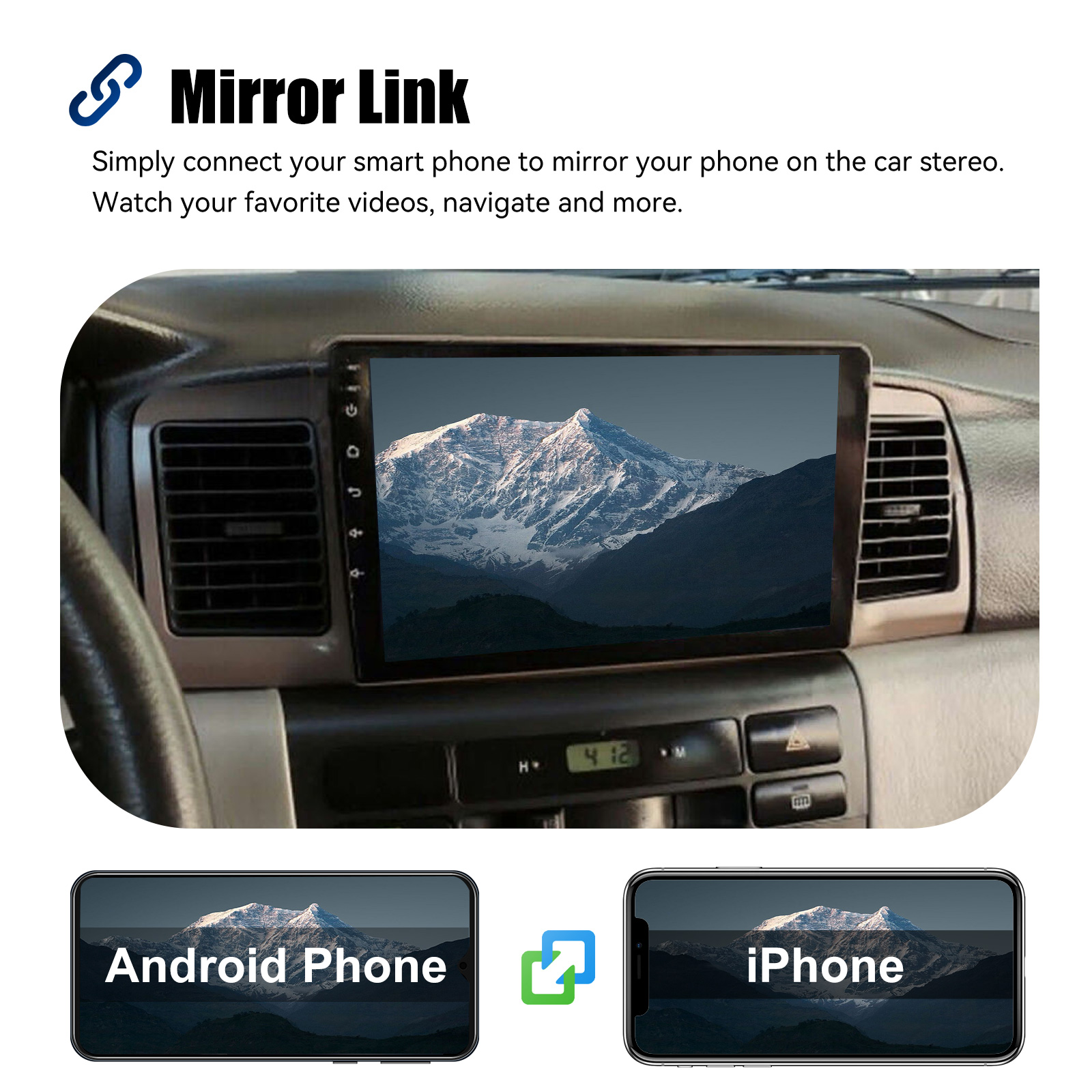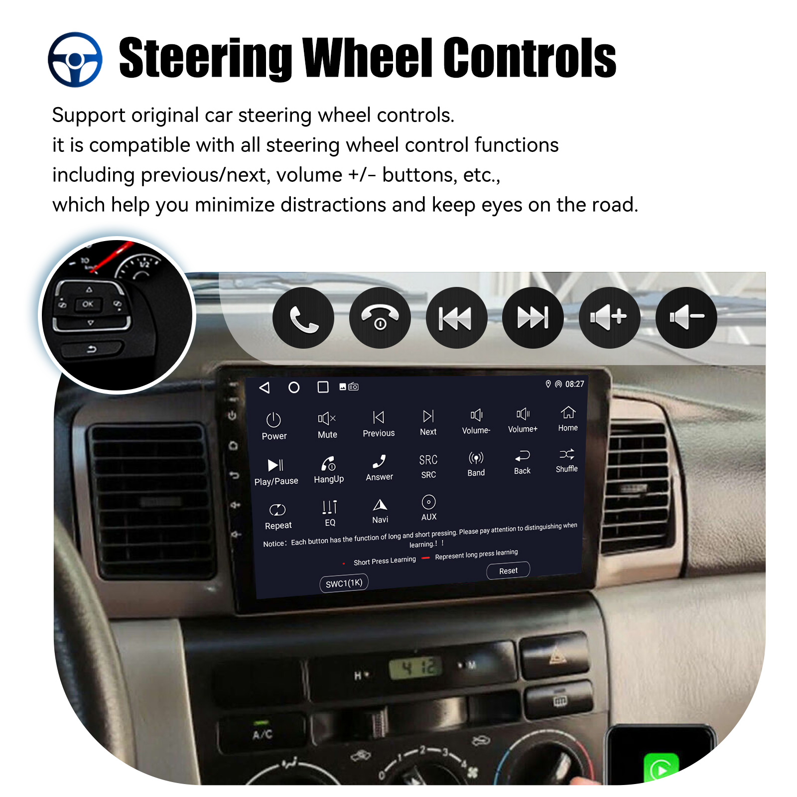9 Inch Android 14 Car Radio For Toyota Corolla (2003-2008): The Android car radio with 9" 1280*720 2.5D HD capacitive touch screen, 1GB RAM and 32GB ROM allows you to download your favorite apps and videos, so that driving will never be boring .No additional frame, no cable change, plug and play.