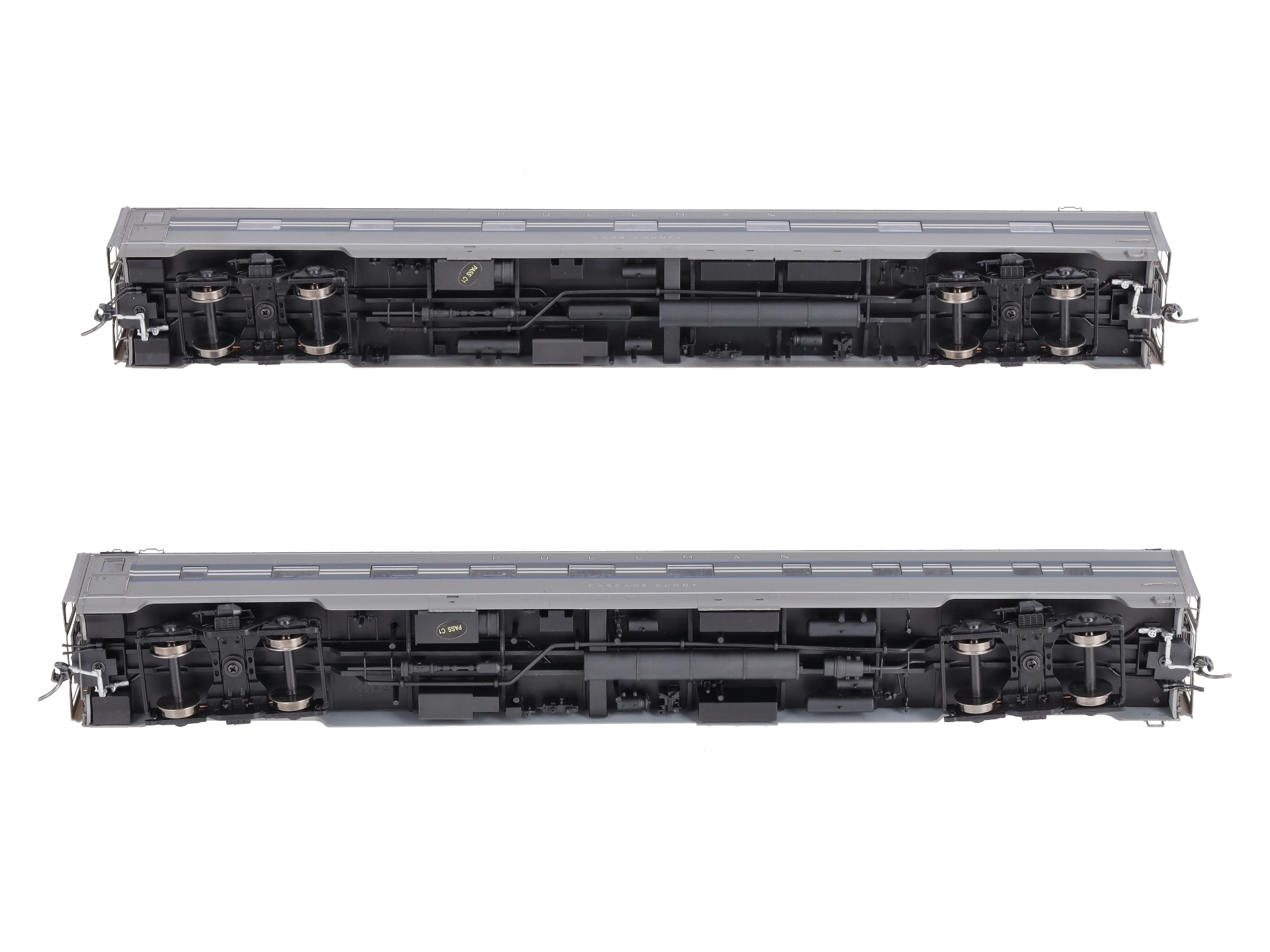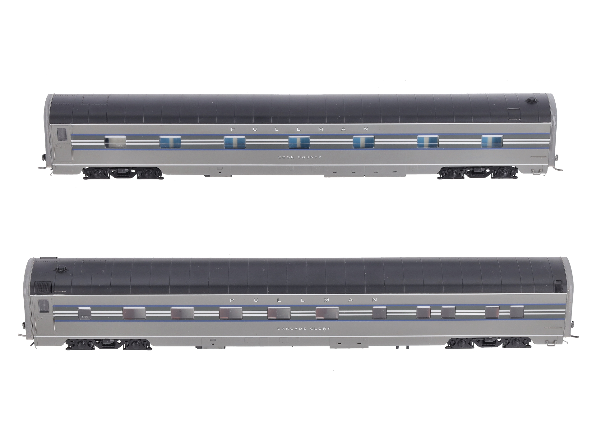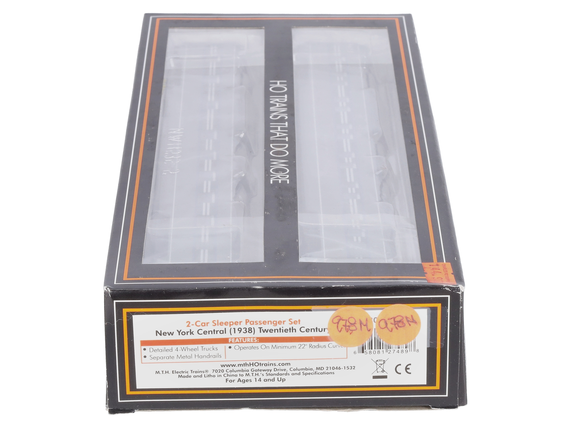 Here is a MTH 80-60023 HO New York Central 1938 Sleeper Passenger Car Set (Set of 2). Car names: 10-5 sleeping car. Cascade Glory, 13 bedroom sleeping car: Cook County. In styling the interiors for the 1938 Century, Henry Dreyfuss made frequent use of subdued blues and grays and leather seating - creating an elegant setting to complement the exciting clientele that frequented the Century, a favorite of movie and theatre people and businessmen on the rise. One highlight was the dual-purpose dining cars, whose white linens were replaced with rust-colored table cloths when the cars became the Café Century night club after dinner.