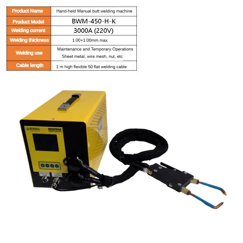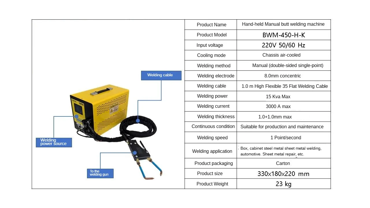 Product name:Handheld manual butt welder Model:BWM-450-H-K Input Voltage:220V 50/60Hz Cooling method: air-cooled chassis Welding method: manual (double-sided single-point) Welding electrode: 8.0mm concentric Welding cable: 1m highly flexible 35 flat welding cable Welding power: 15Kva max Welding current:3000A max Welding thickness: 1.0+1.0mm max. Continuous working condition: suitable for temporary production work and maintenance Welding speed:1 point/second Welding Applications:Box, cabinet steel sheet metal welding, automotive sheet metal repair, etc. Packing:Carton Dimensions:330x180x220mm Product weight:23kg