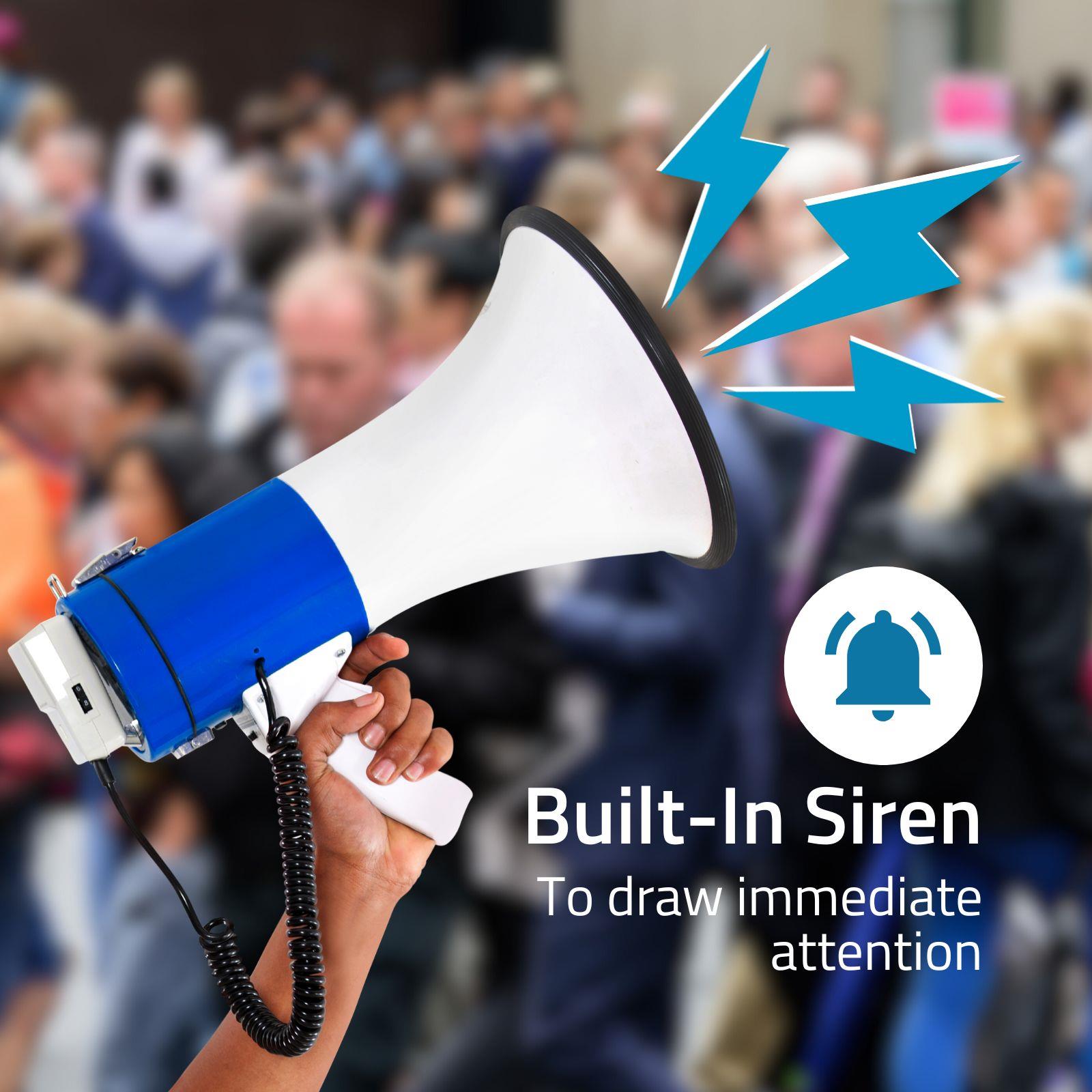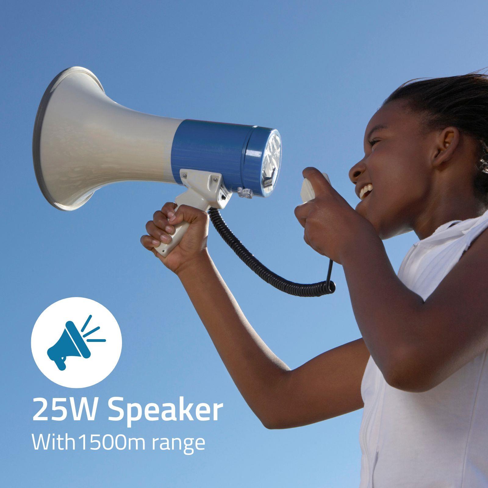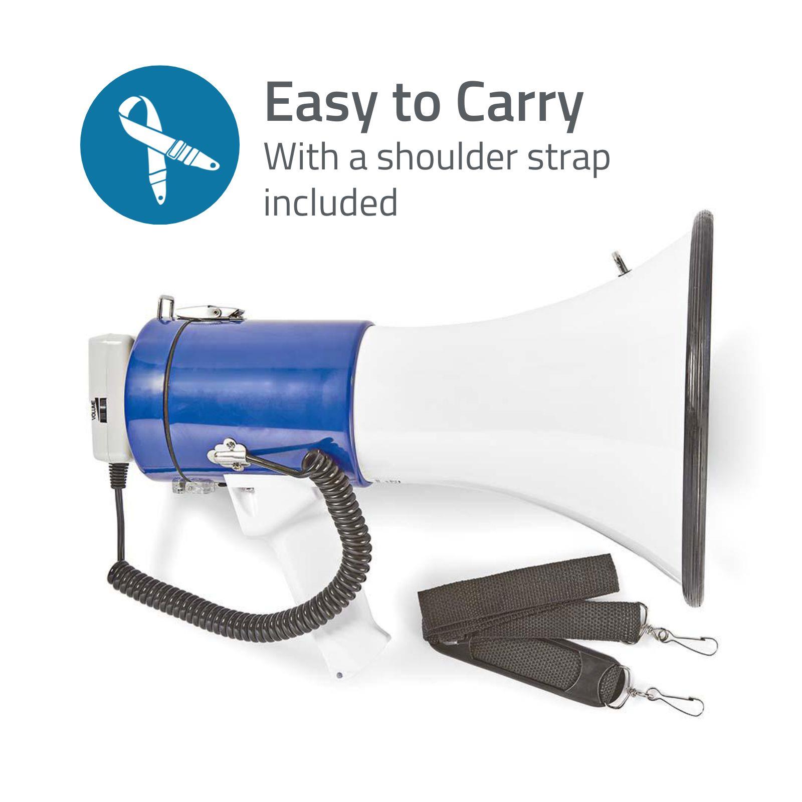 Get your message across to a large public with this powerful Sweex megaphone with built-in siren. Super efficient during large-scale events, evacuations and other situations where you need to address a big crowd. Need to speak for a longer period of time? Just hang the megaphone from your shoulder with the included strap, detach the microphone and use it handheld.