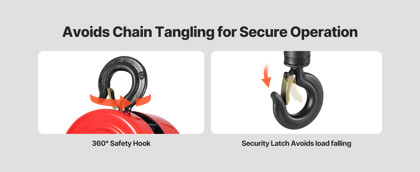 - Ganci girevoli a 360°: entrambi i ganci ruotano di 360° per un posizionamento facile e flessibile. Il blocco di sicurezza della caduta manuale della catena garantisce un utilizzo sicuro e l'angolo di sollevamento mantiene la catena senza grovigli