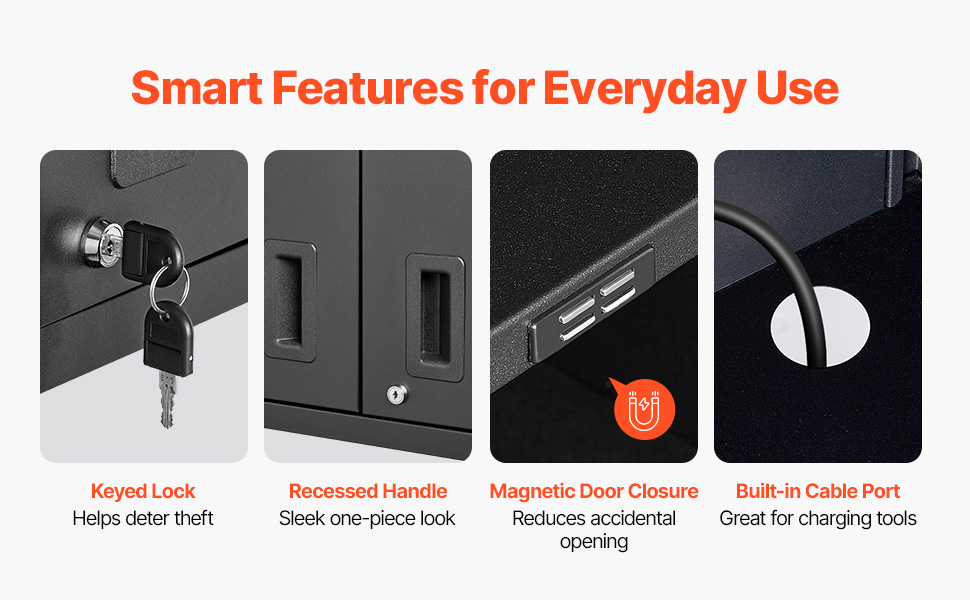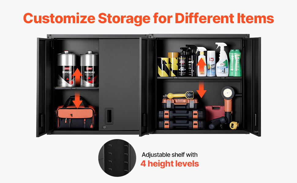 Porte di facile accesso: le doppie porte laterali si aprono agevolmente per un rapido accesso. Una serratura dell'armadietto portautensili da garage sospeso mantiene gli oggetti al sicuro, mentre le chiusure magnetiche mantengono le porte ben chiuse per un utilizzo affidabile.