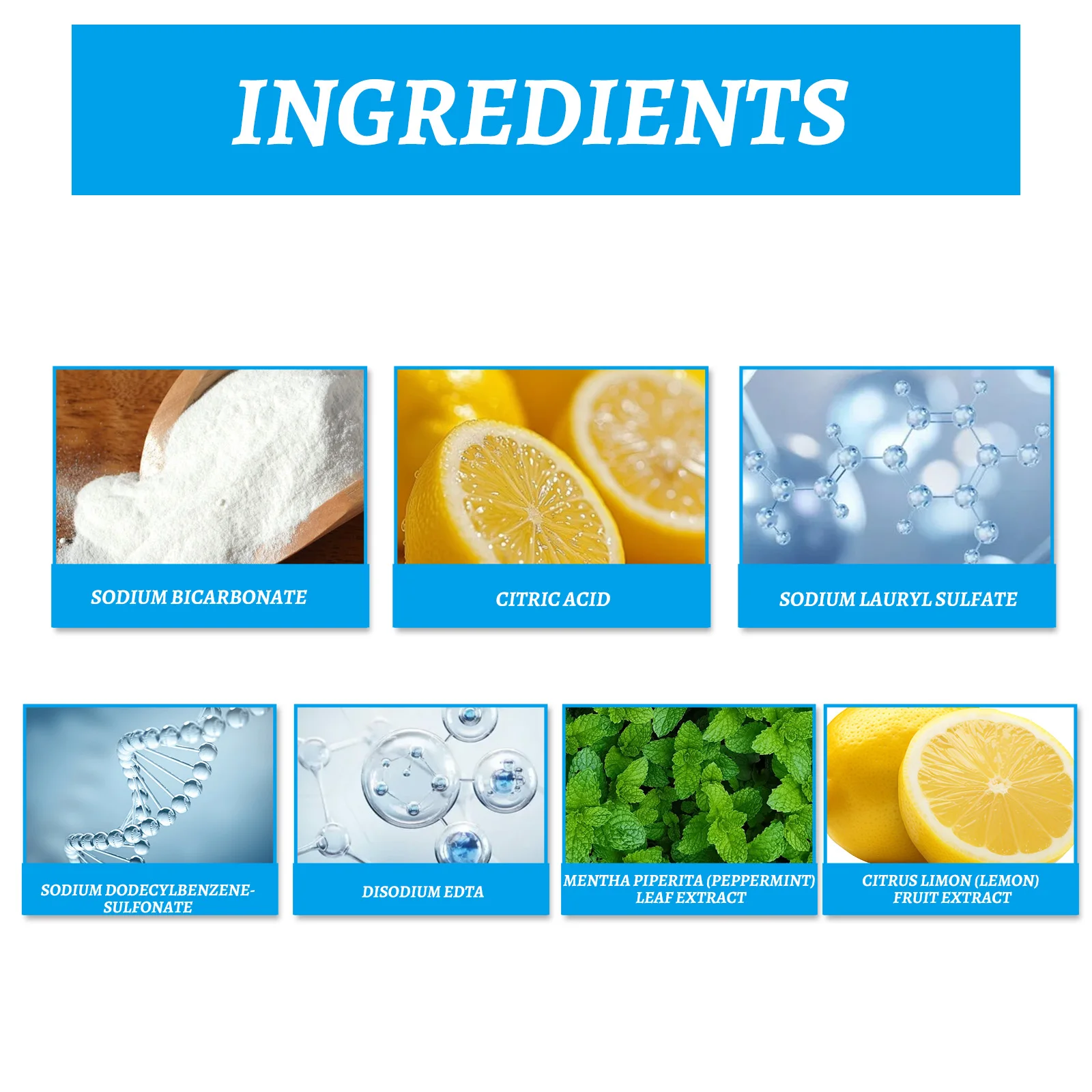 1. Our washing machine effervescent tablets contain sodium bicarbonate and citric acid. They easily eliminate dirt and odors, penetrating deep into every part of your washing machine to keep it clean and hygienic.