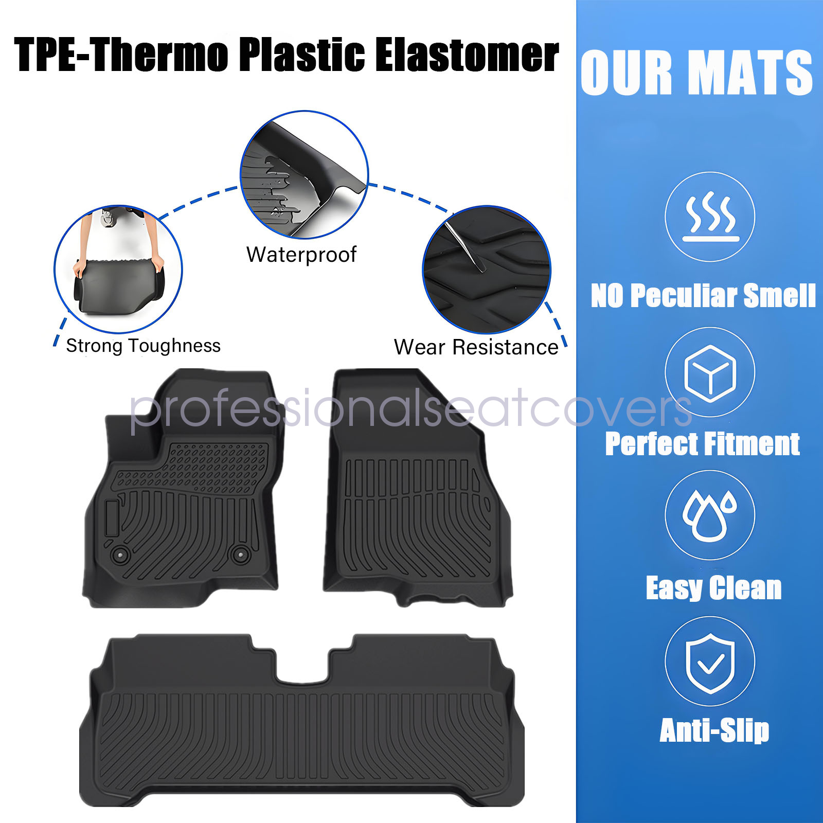 Soillar floor mats use elastic TPE (Thermoplastic Elastomer), No foul odor is produced even at high temperatures. soft touch and exquisite finish. This floor mats are skid-proof and recyclable.